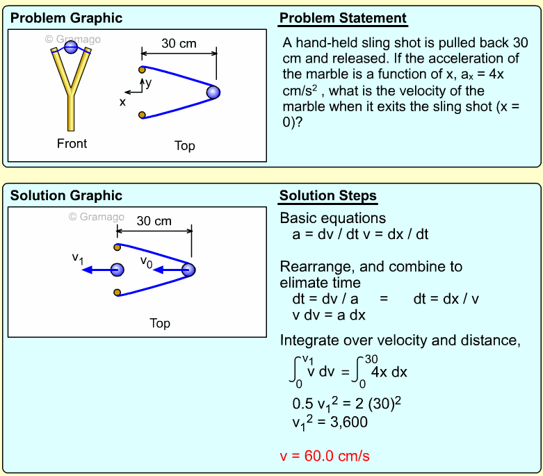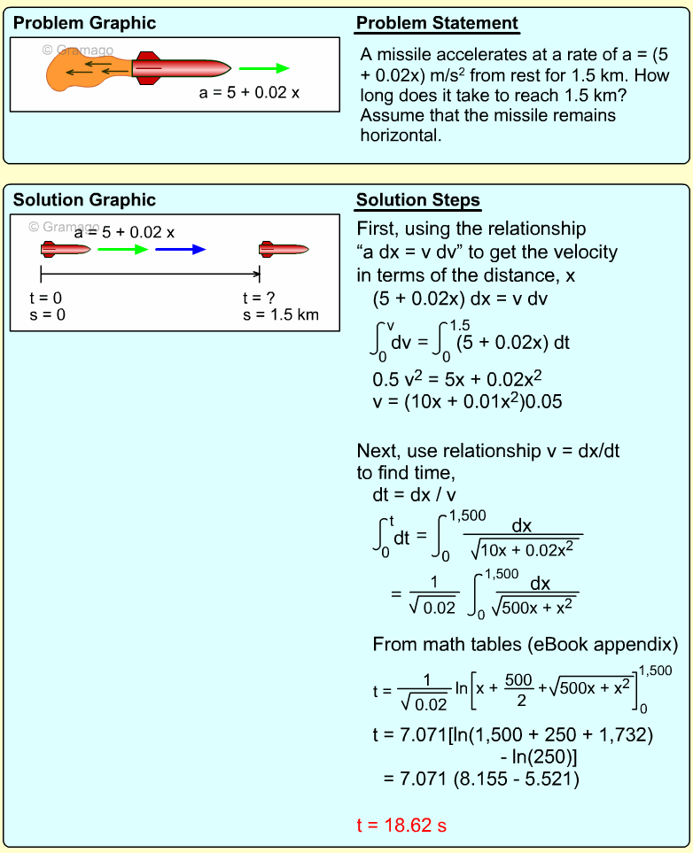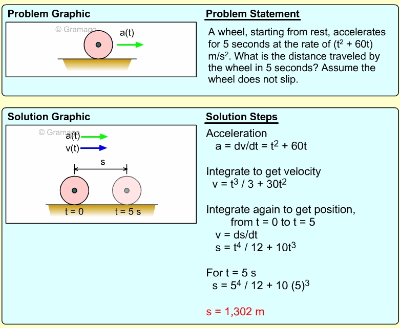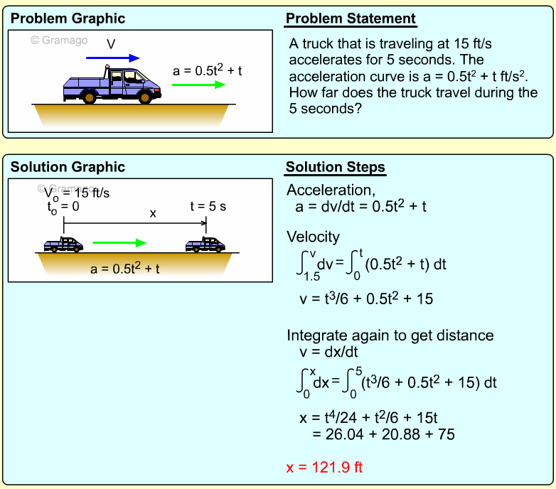 Since distance is needed, the acceleration equation must be integrated twice. First, find the velocity function,