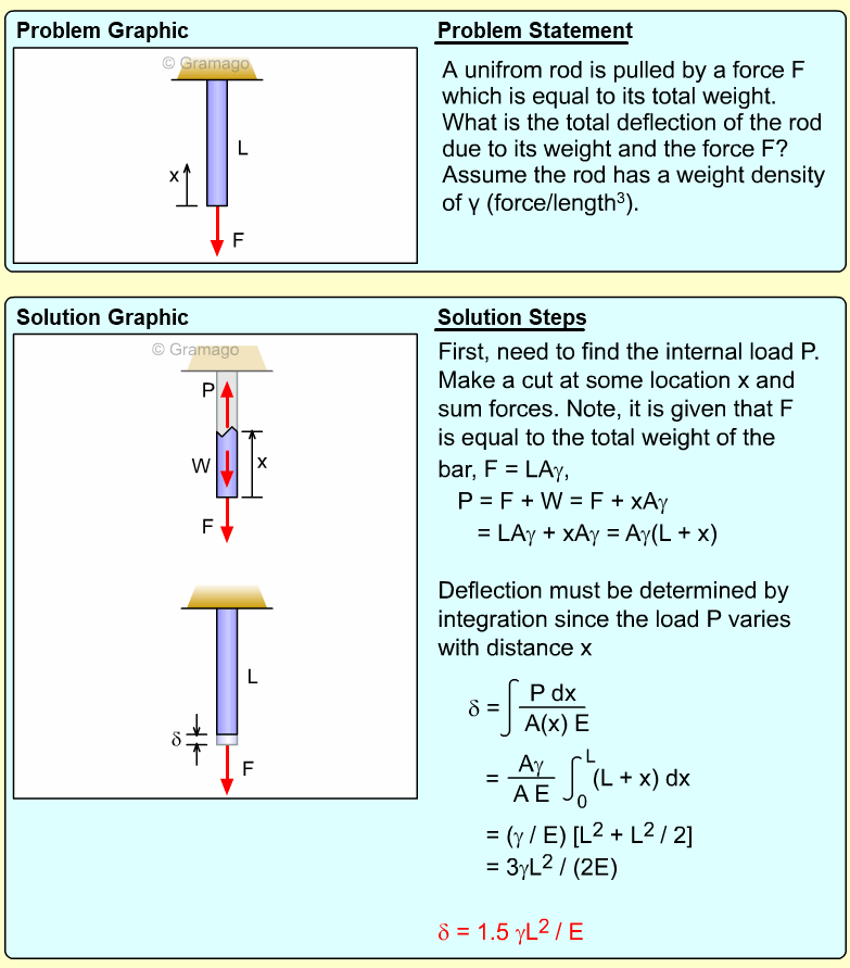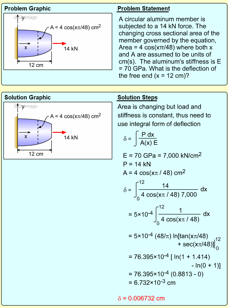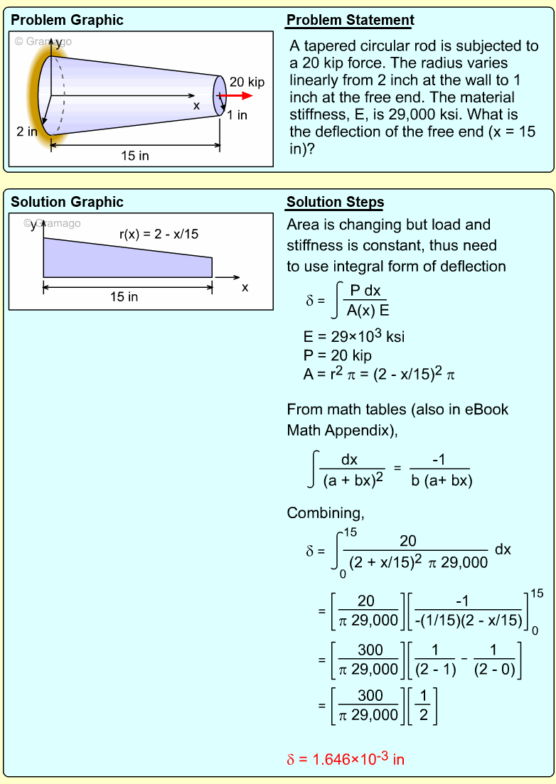 The load P and stiffness E are constant, but the area, A changes over its length. The rate of change is linear, and can be modeled as