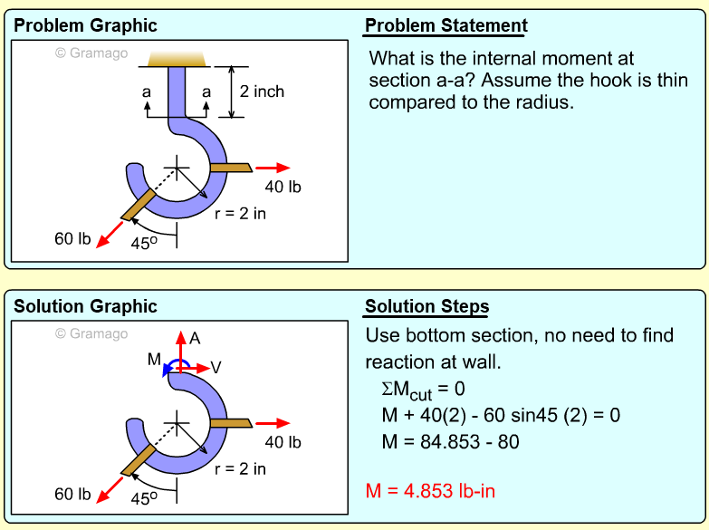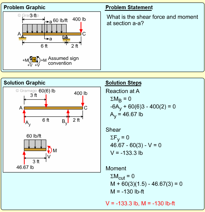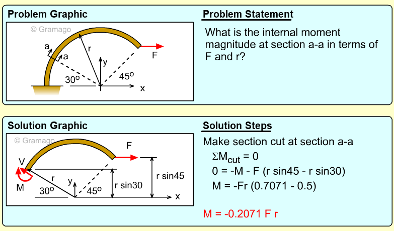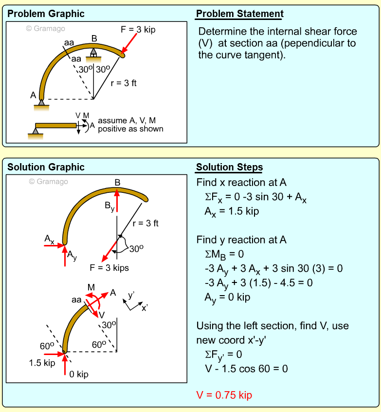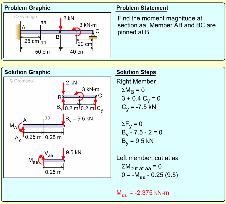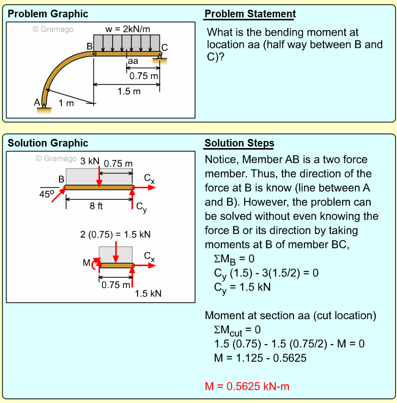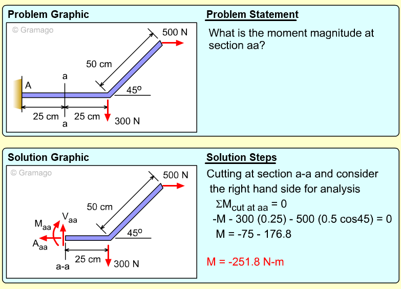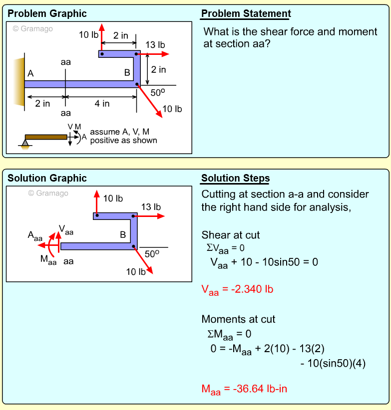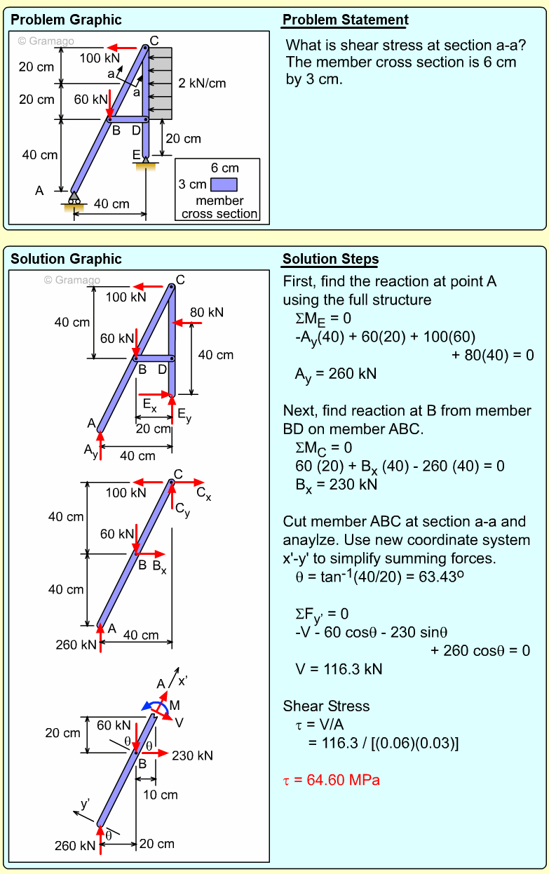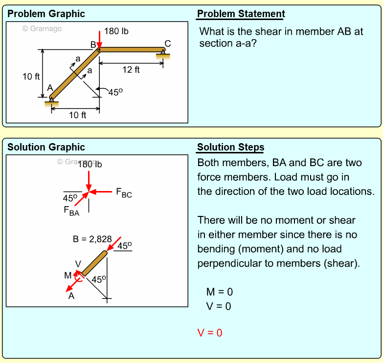 Member AB can now be cut member at a-a. At the cut, both the shear and moment internal forces are unknowns. The vertical and horizontal components of the force FAB are