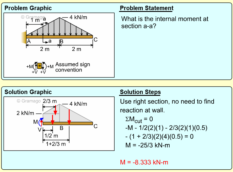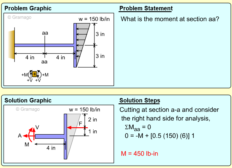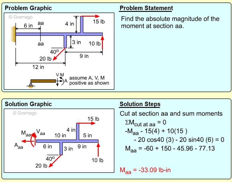 Vertical and horizontal distances are shown on diagram. Summing moments at the cut gives,