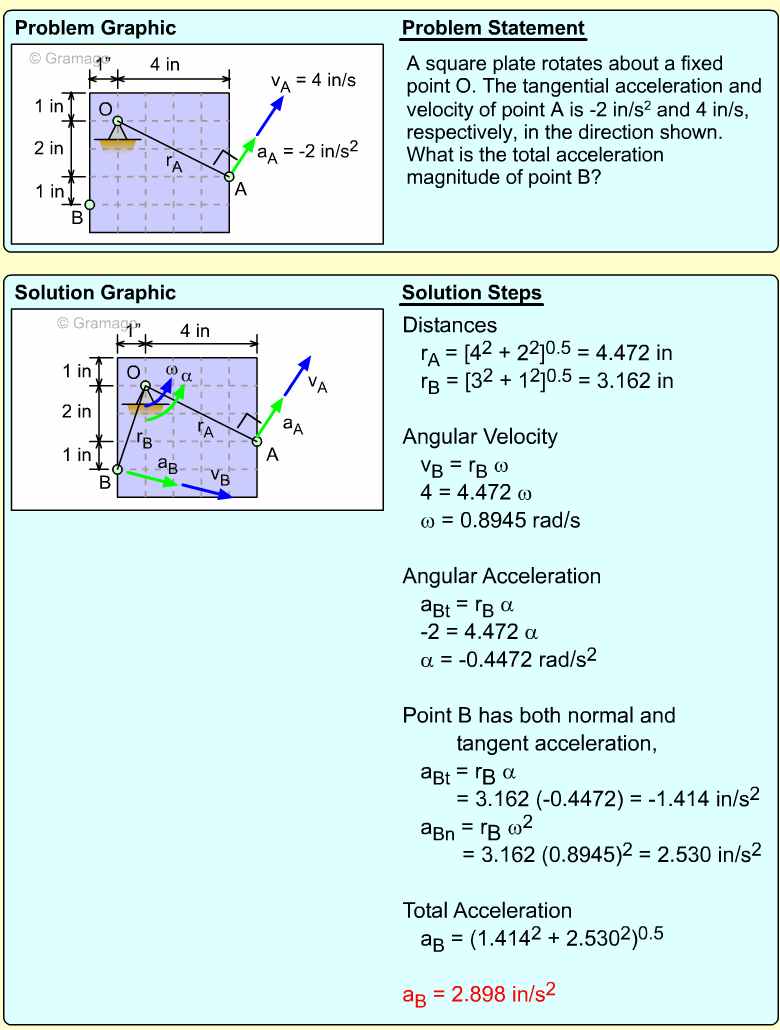 This problem is a basic fixed-axis rotation problem since the problem explicitly states there is a fixed shaft. First, determine the angular velocity and angular acceleration.
