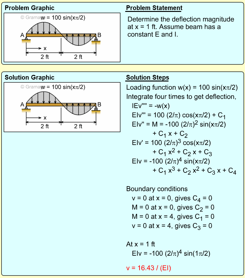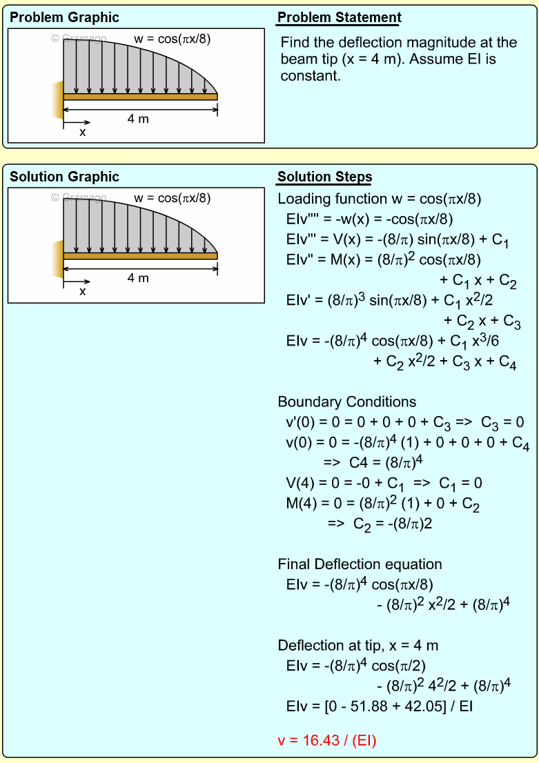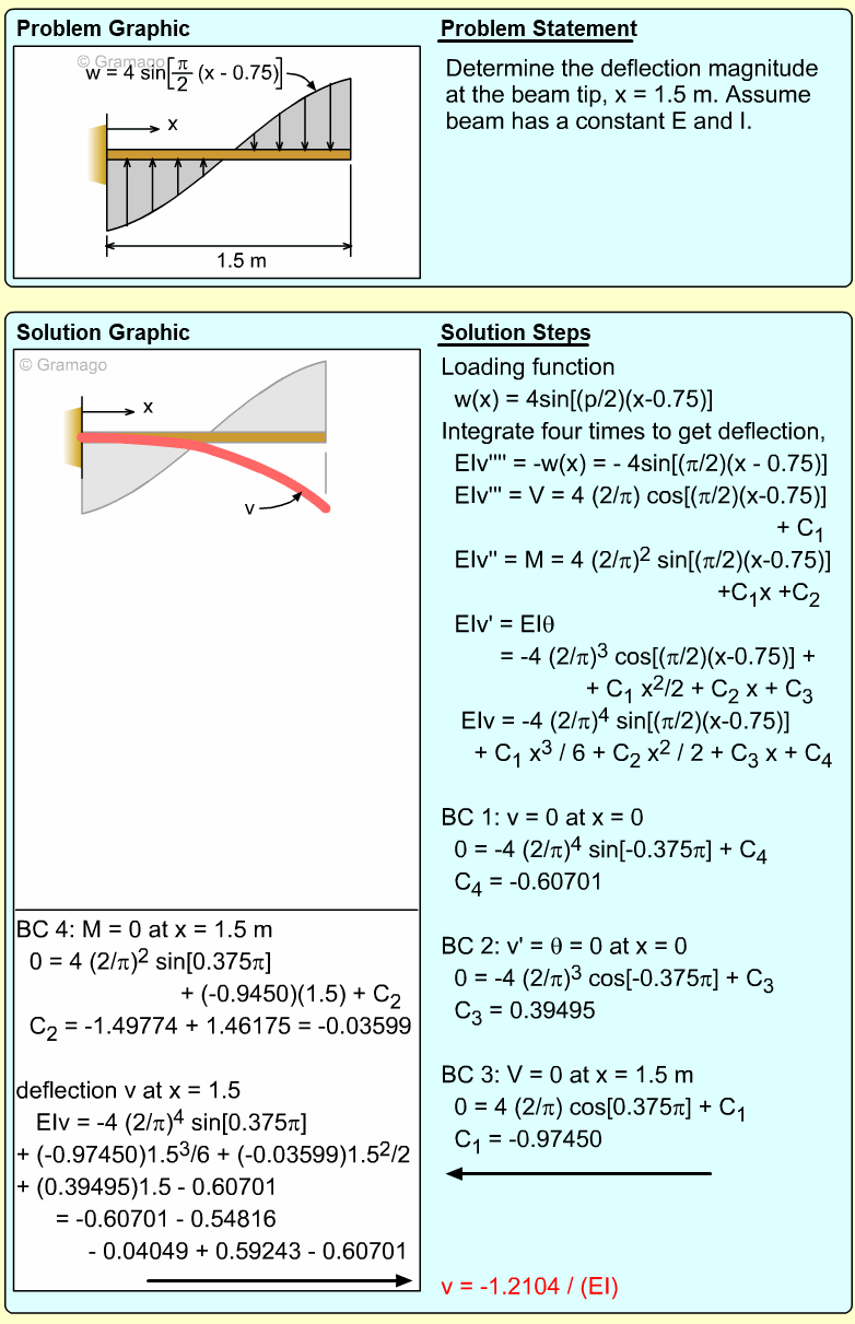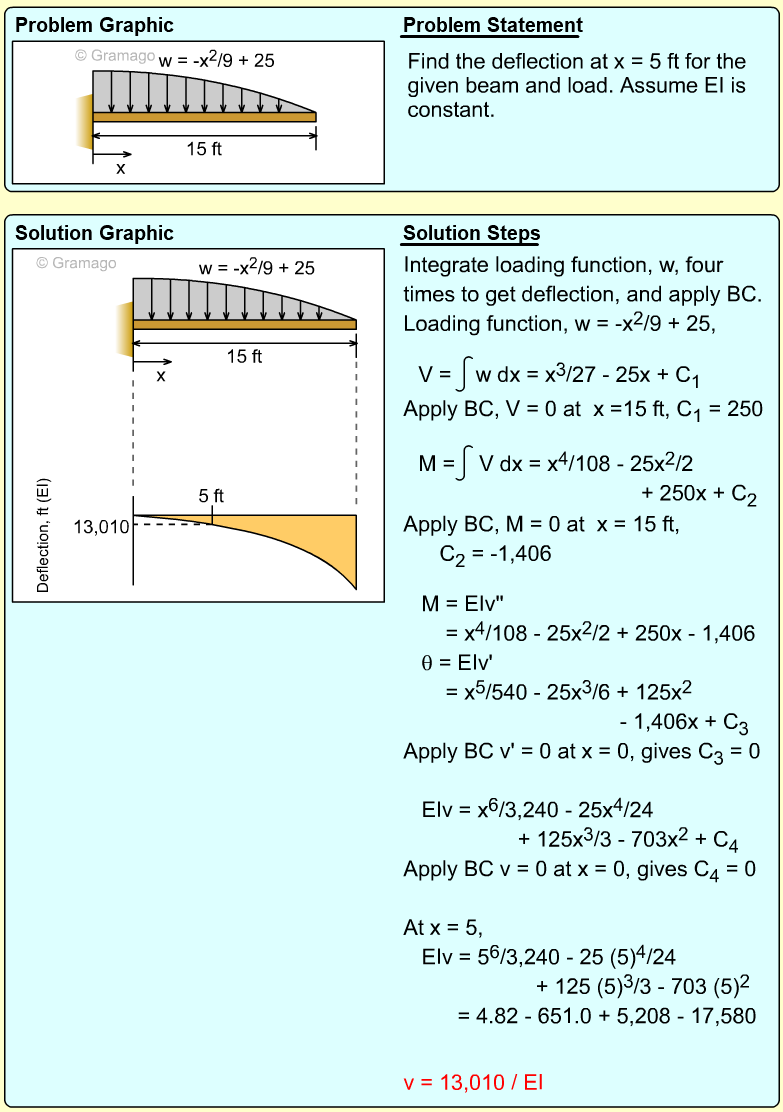 v = -w (x 4/8 - Lx3/2 + xL3) / (3EI) |
