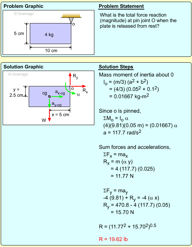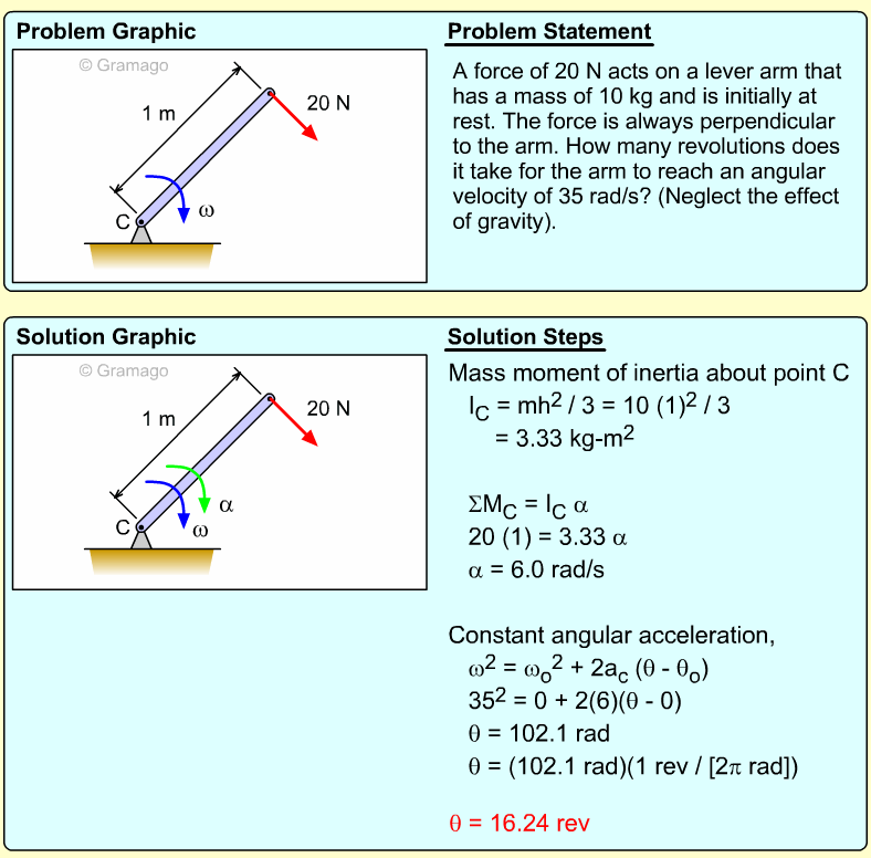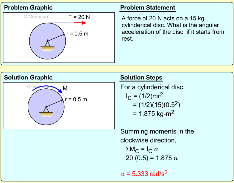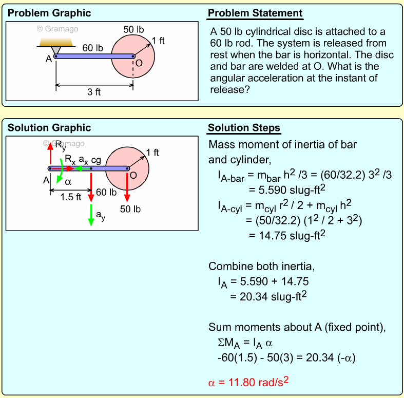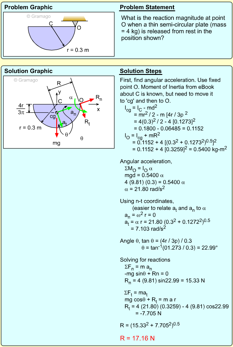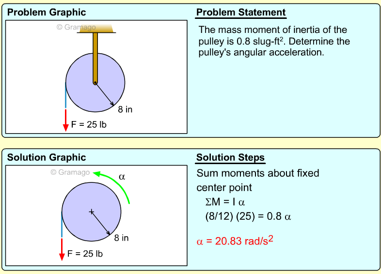 Find the angular equation of motion for the wheel by summing all forces about O. Note, the wheel weight acts through the wheel's center of mass, and the moment of inertia, I, is related to the radius of gyration, k (I = mk2). Equating the moments to the angular acceleration gives,