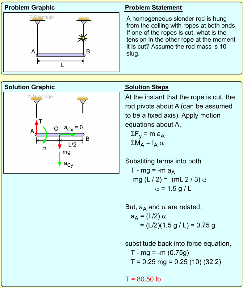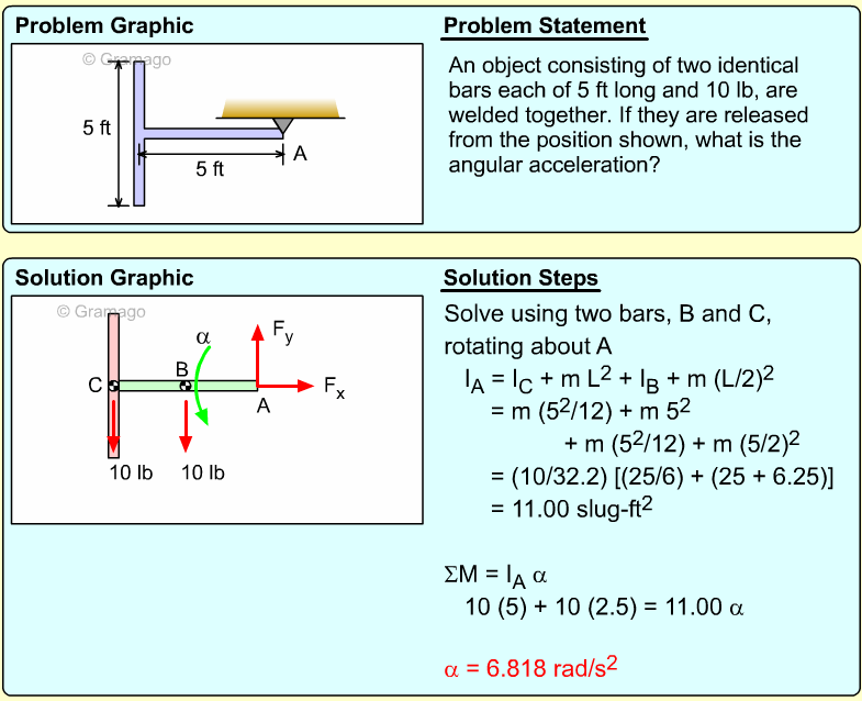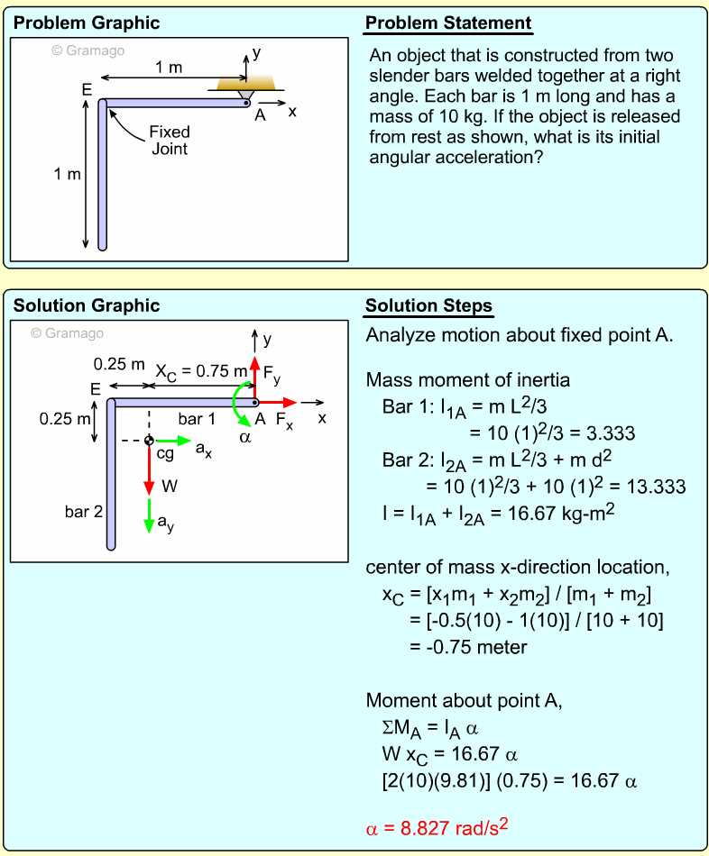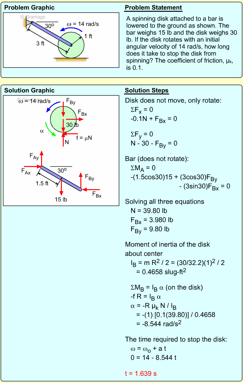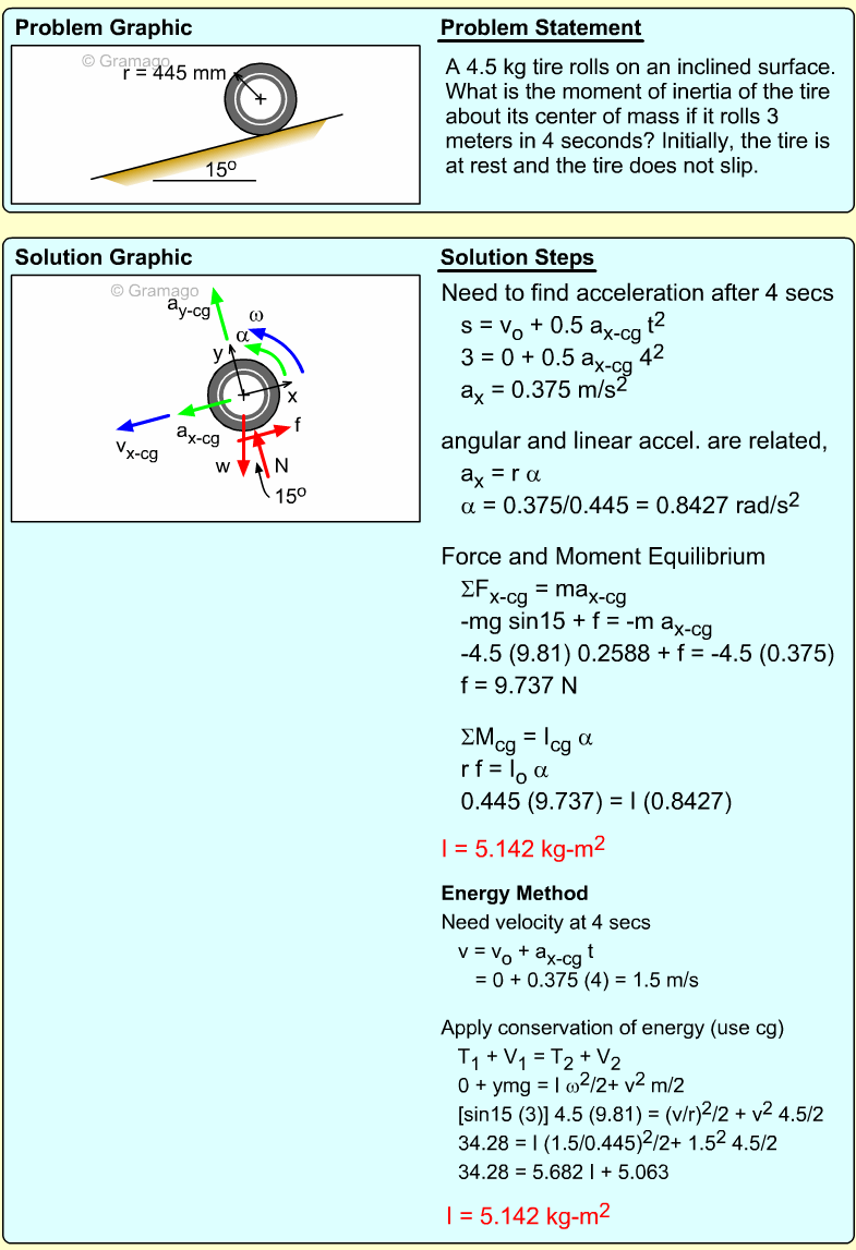 Find the angular equation of motion for the wheel by summing all forces about O. Note, the wheel weight acts through the wheel's center of mass, and the moment of inertia, I, is related to the radius of gyration, k (I = mk2). Equating the moments to the angular acceleration gives,