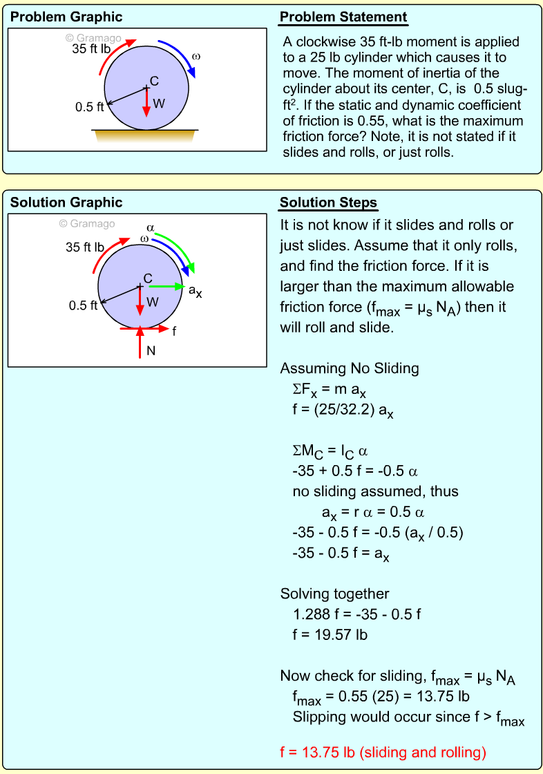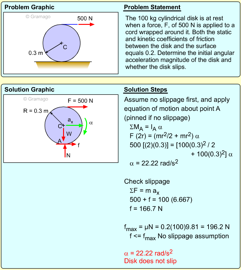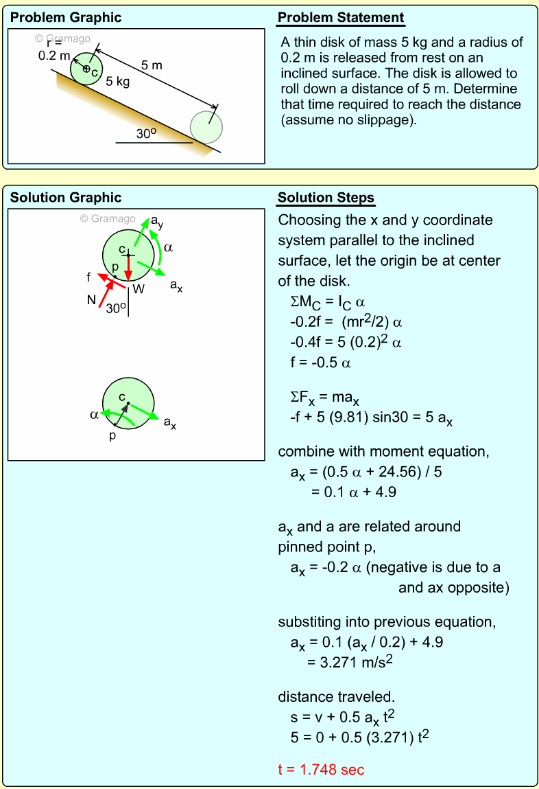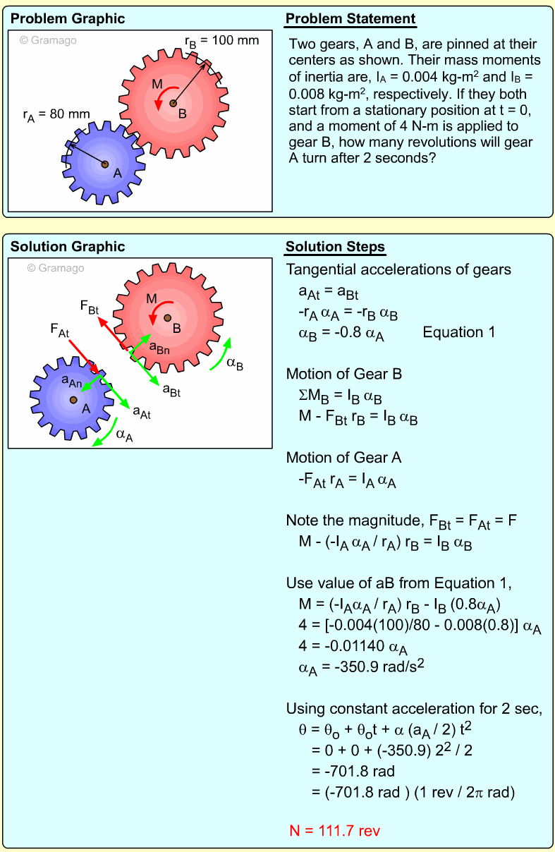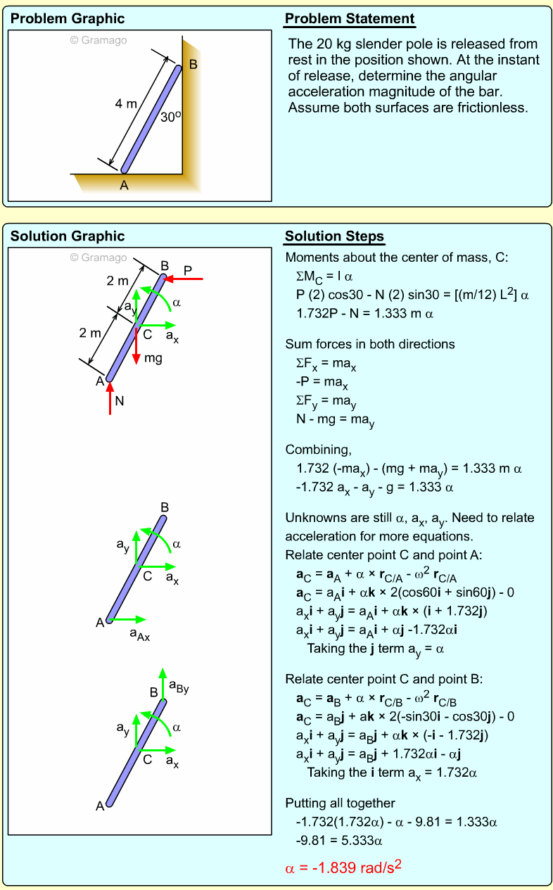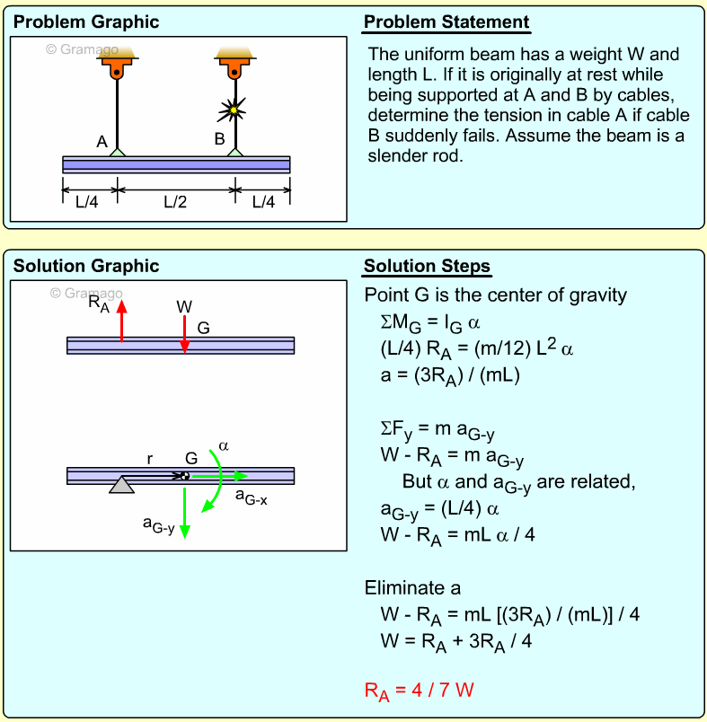 These three equations have five unknowns, so additional relationships need to be identified. One idea is to use the IC point to relate α and the two linear accelerations, aGy and aB. At the instant given, the spool is pivoting around the point where the ceiling cable is attached to the spool, and thus has zero velocity. Thus,