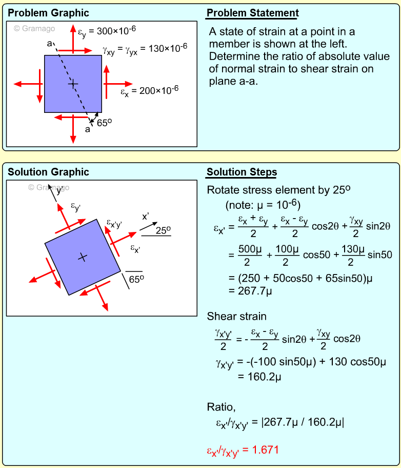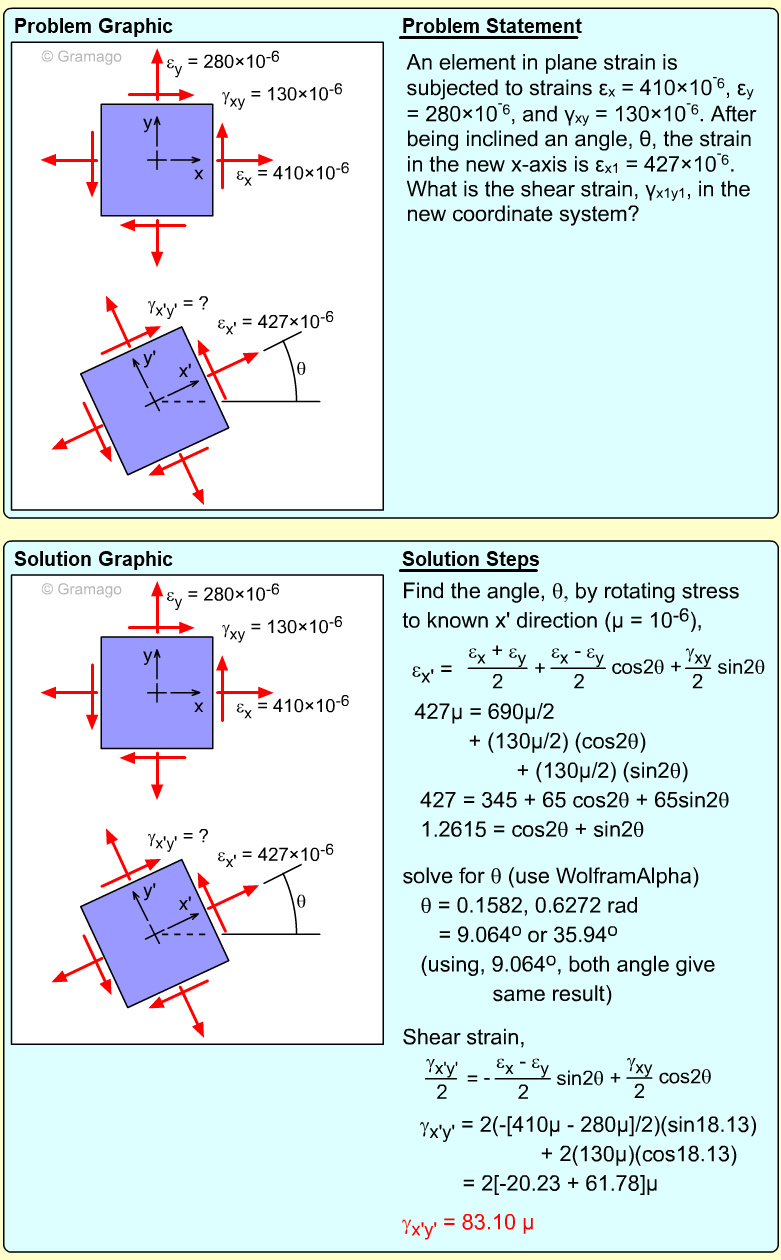 Notice there are two possibilities. Both will give the same principal strains as will be shown below. For 15o, the two normal strains are,