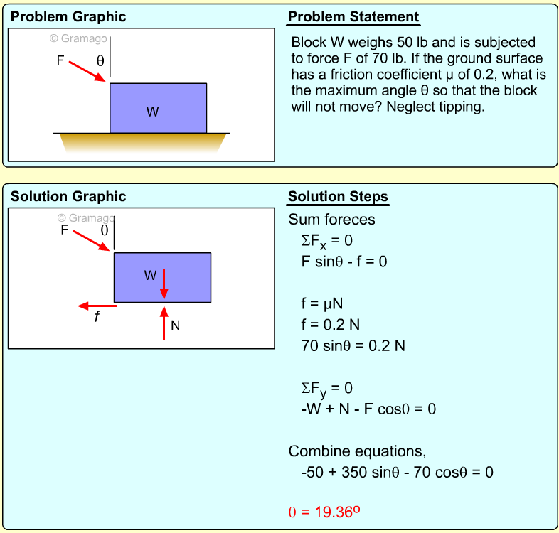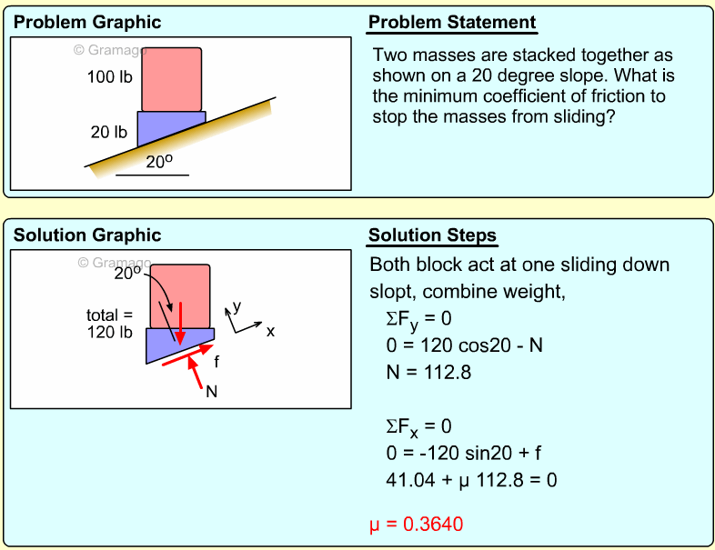 Notice from the calculation that static coefficient of friction, μ, is independent of the weight of a box. Also, knowing the inclination angle of the bed is a convenient way of measuring the coefficient of static friction. |