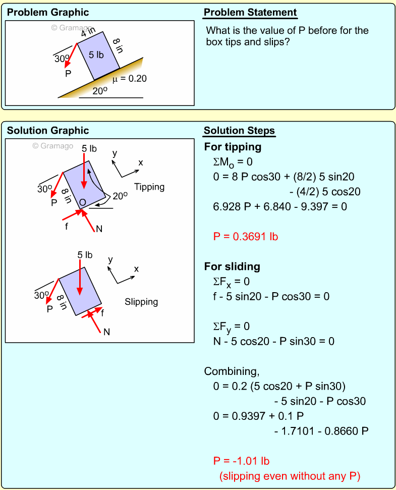 There are three possible forces acting on the box, its weight, reaction force due to the ground and the friction force. The location and direction of these forces are shown on the free-body diagram of the box on the left. Let the resultant normal force, N be acting at point A. There are two unknowns, N and Fs.