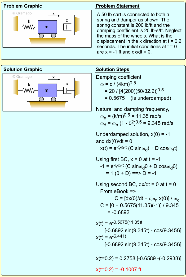 At t = 0, the initial conditions are x = -0.1 m and v = 5 m/s, giving,