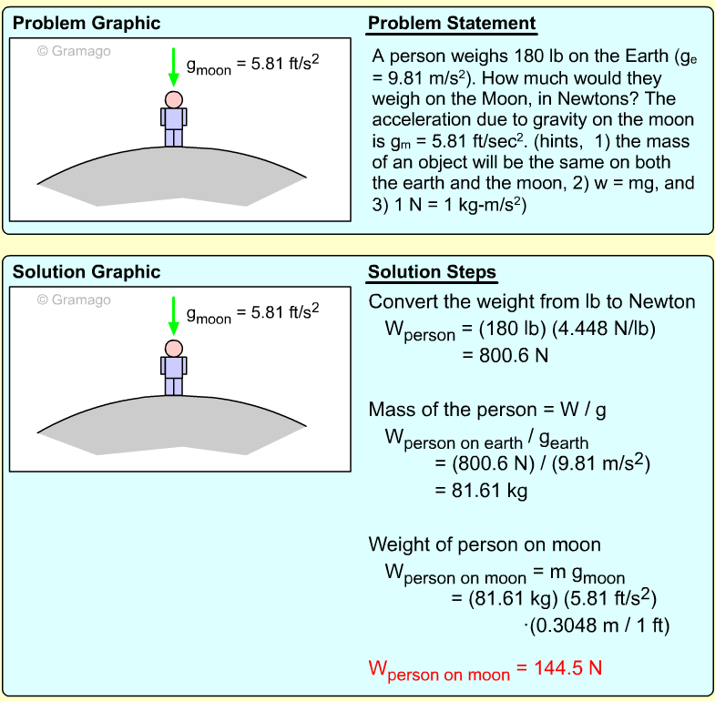 When the module is on the moon, g is 5.321 ft/s2. Its weight can be found by multiplying the mass by the gravitational acceleration (both in US units)