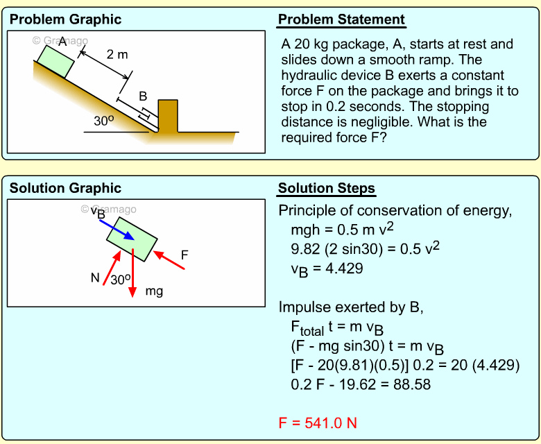 The distance the box travels up the slope can be determined using either line motion or energy concepts. Using the conservation of energy (kinetic and gravity), gives