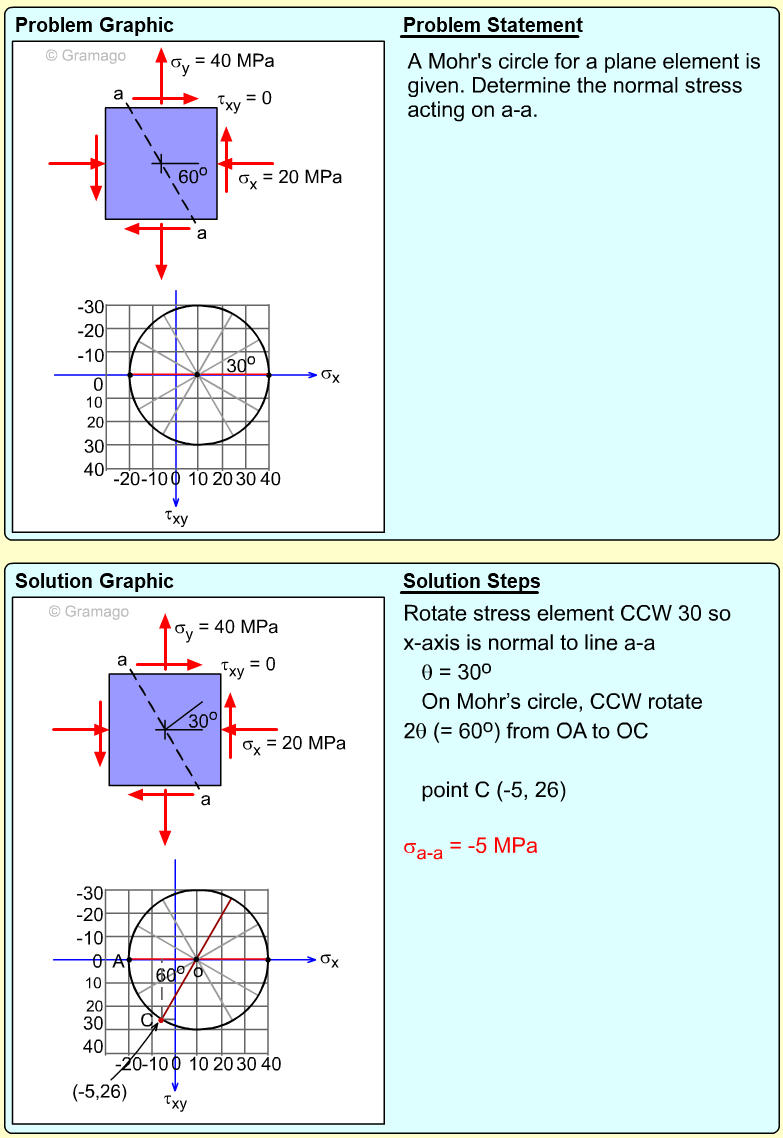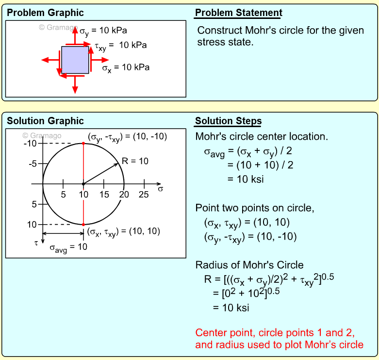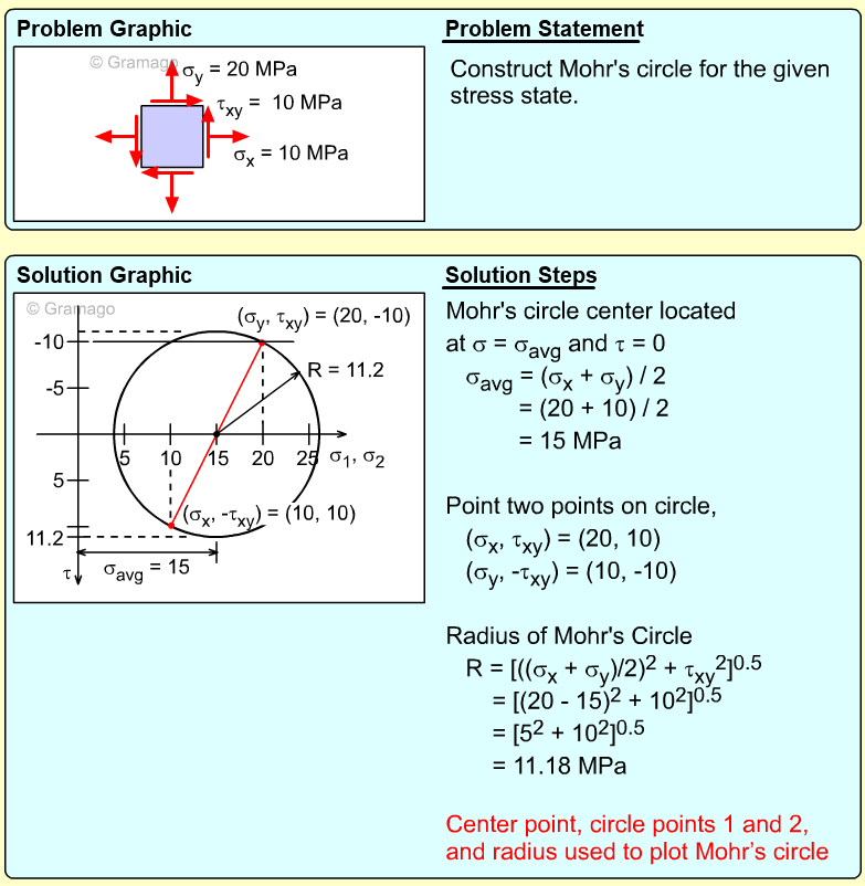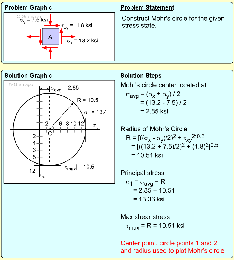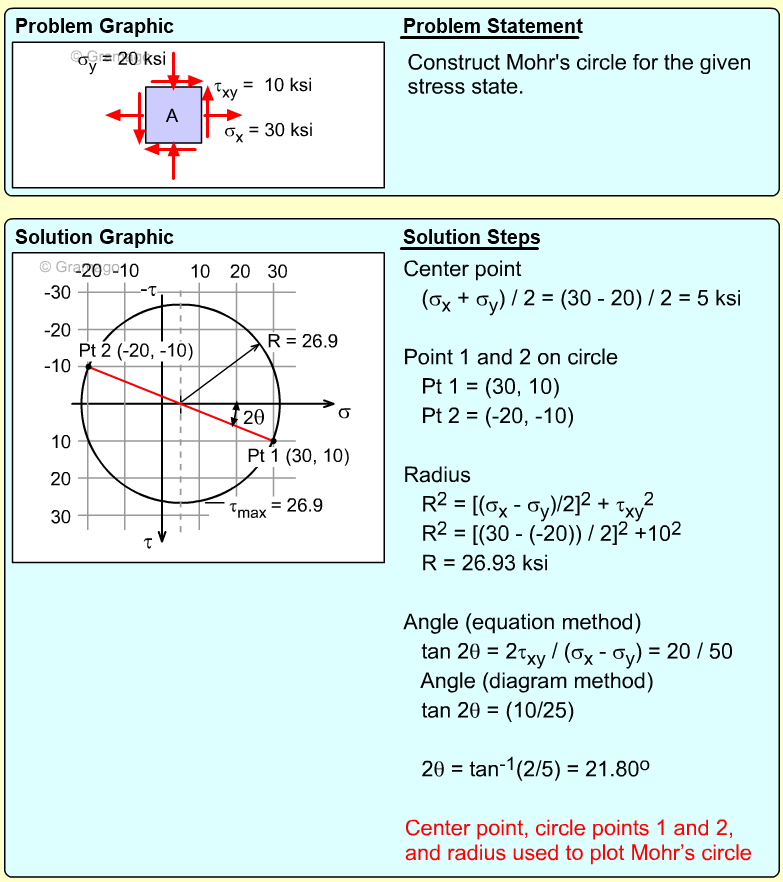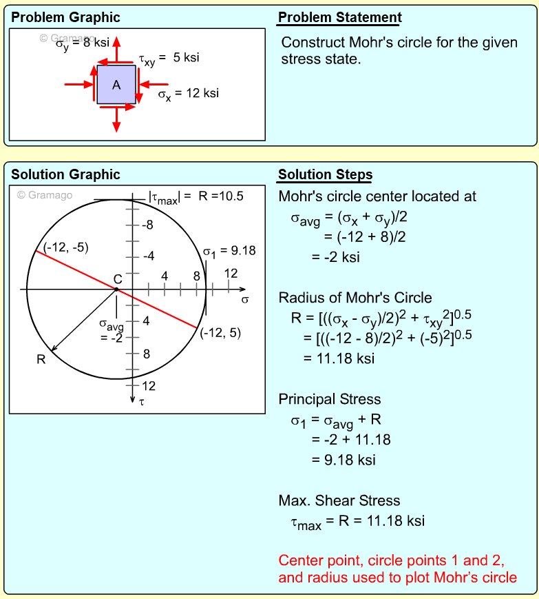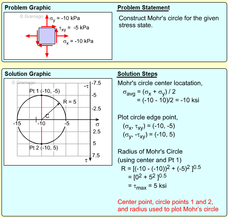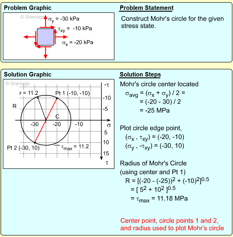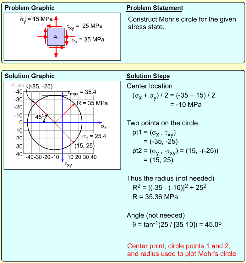 Remember, the shear stress is plotted positive in the downward direction. From the plotted center and points on the circle, the radius (shear maximum) can be determined.
