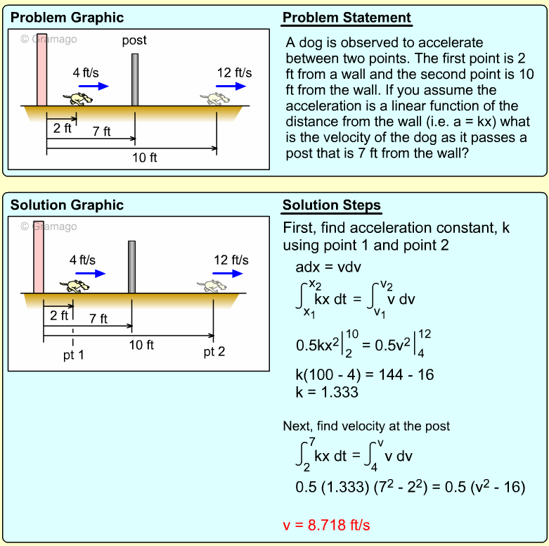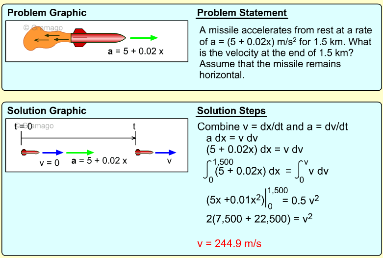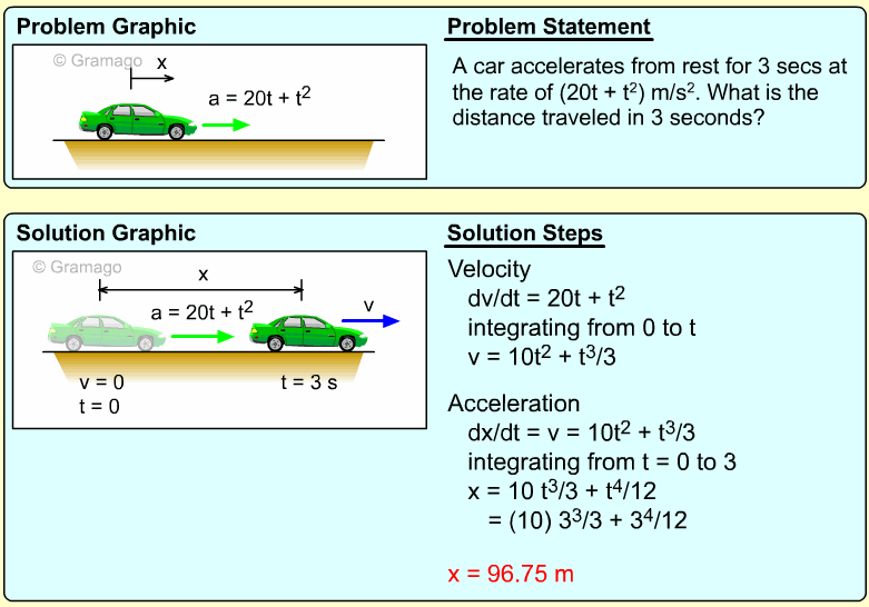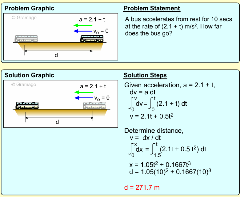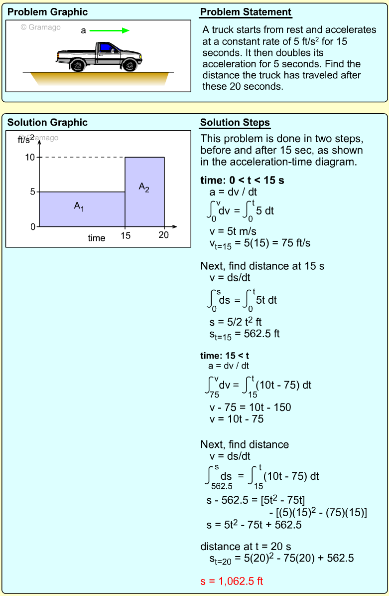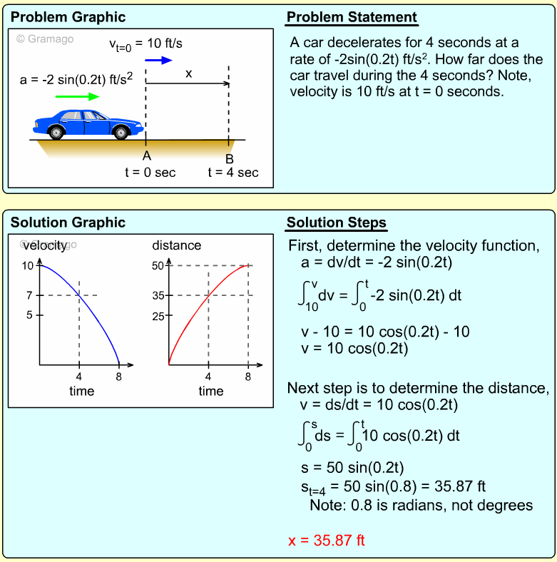 Since distance is needed, the acceleration equation must be integrated twice. First, find the velocity function,