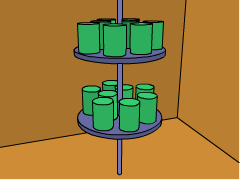 A circular shelf system with two shelves is installed inside a large walk-in
