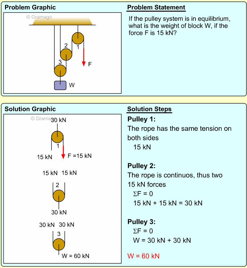 The pulley system for an elevator is shown in the figure on the left. This mechanical system consists of 5 pulleys and 2 electric motors. The maximum allowable weight for the elevator is 5 kip.