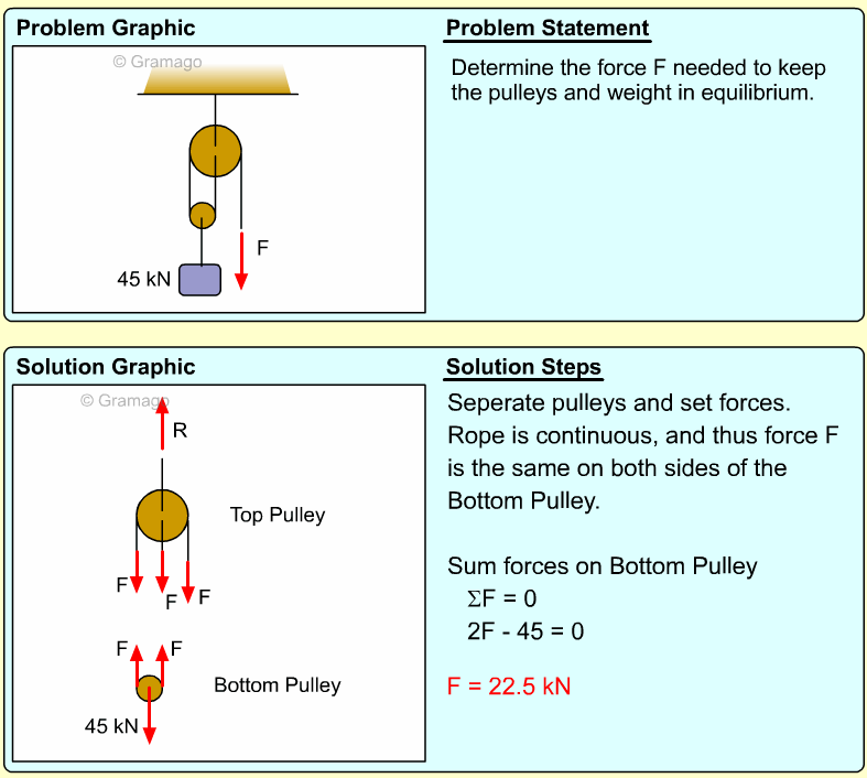 The free-body diagram for pulley number 2 is shown on the left. Note that the free-body diagram for the pulley number 4 would be similar. Summing the forces in the vertical direction gives,