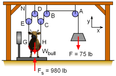 This time it is easier to start with the bull and work though the pulleys to find the counterweight. The FBD for the bull is shown at the left.