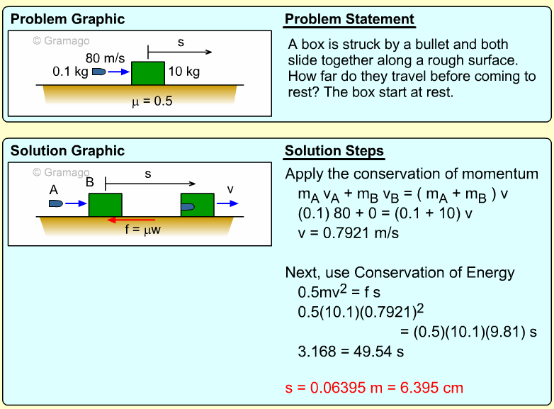 This is a two step problem. The velocity of the combined projectile and box needs to be determined before the distance s can be calculated.