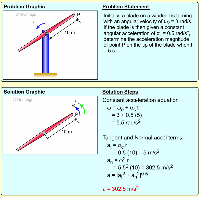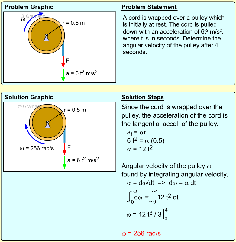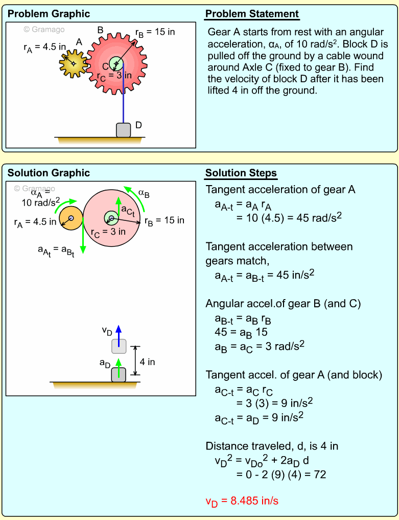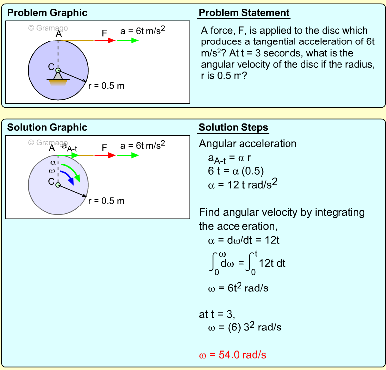 This problem is a basic fixed-axis rotation problem since the problem explicitly states there is a fixed shaft. First, determine the angular velocity and angular acceleration.