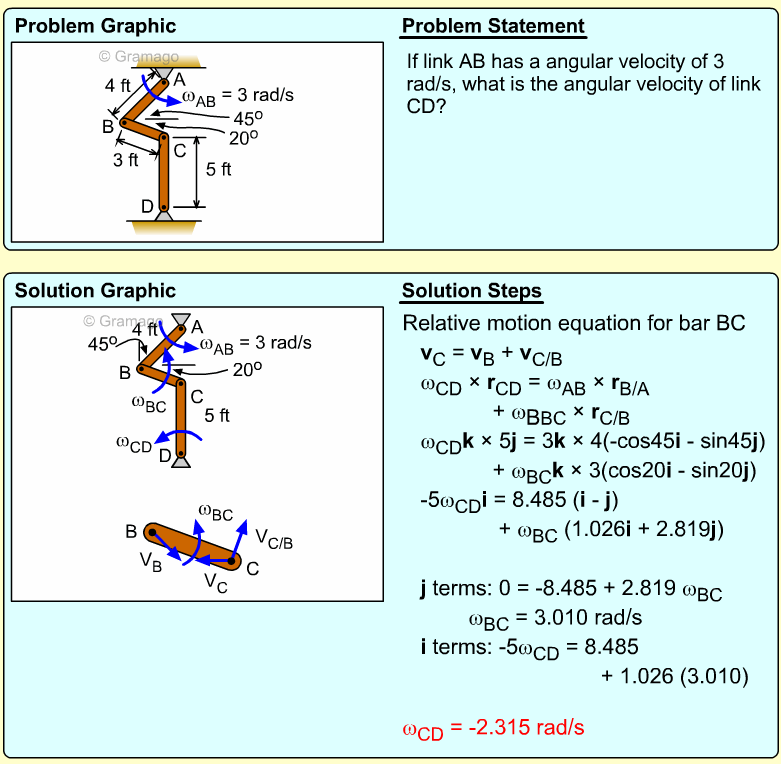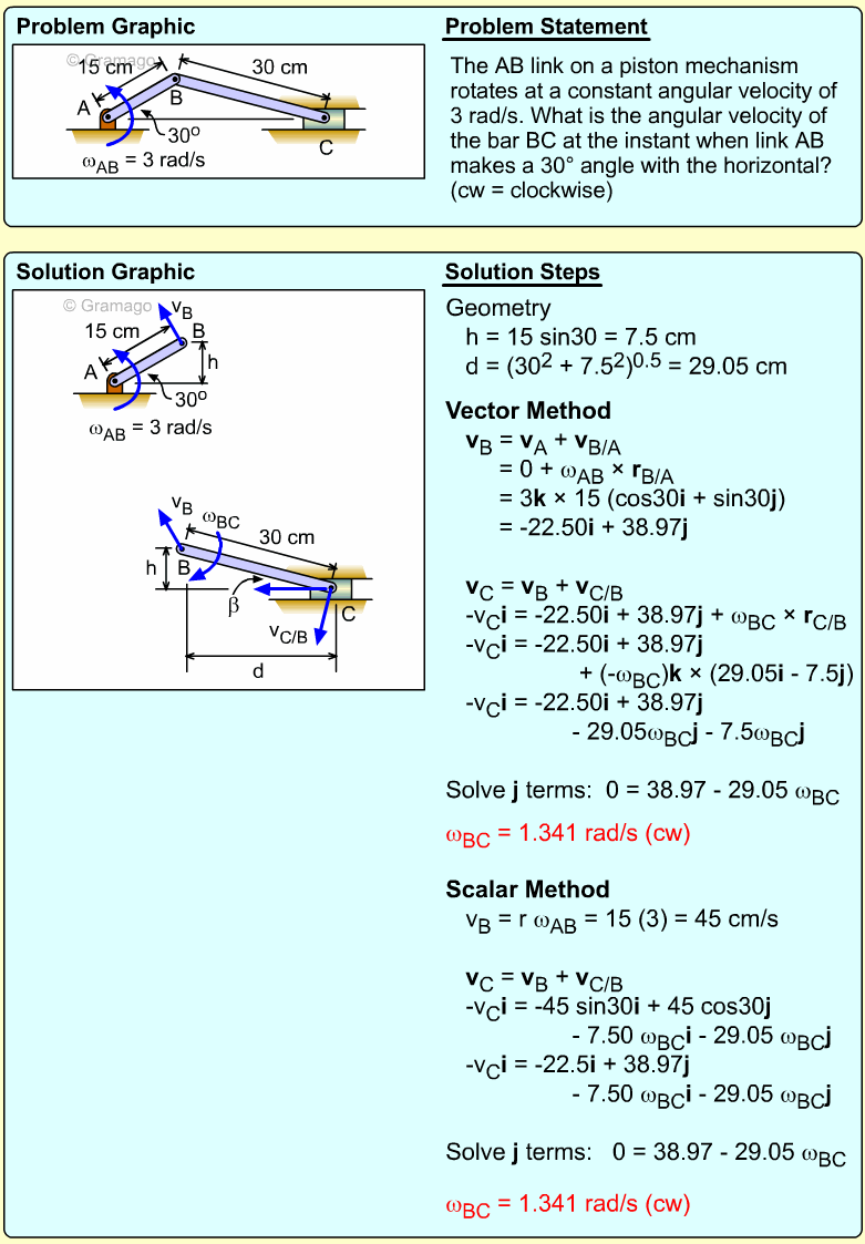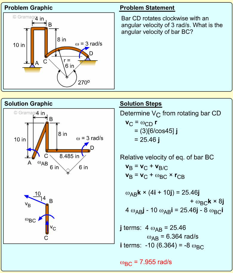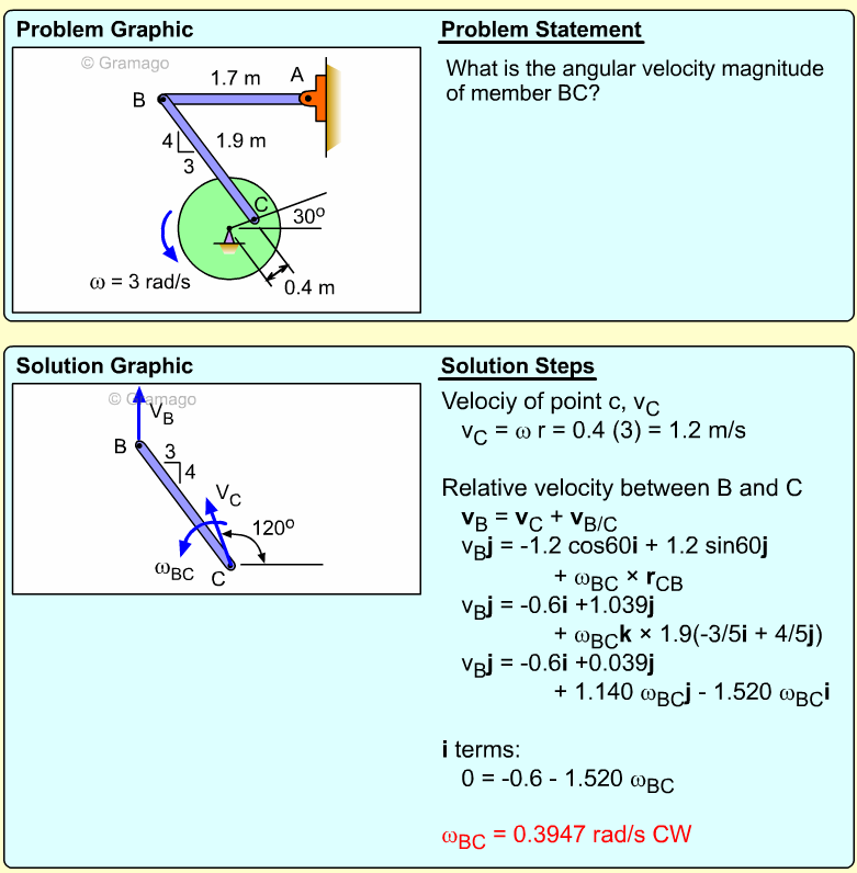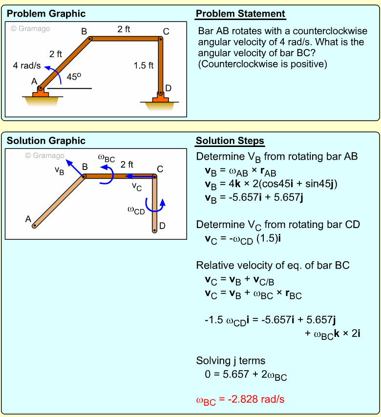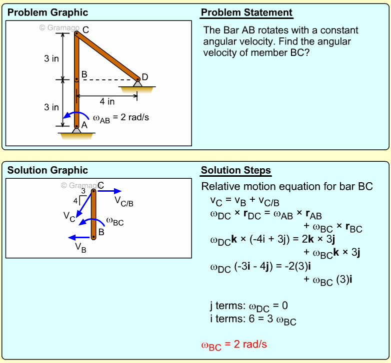 Angular velocity of bar BC is found by relating the velocity of point C to point B,