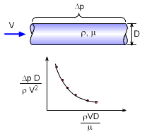 To minimize the experimental effort, the dependent variables are group together to form dimensionless parameters that can be used for other similar pipes. While simple, this is a important tool in developing models for fluid dynamics. An example of five factors that influence pipe flow is shown in the diagram on the left. Two possible dimensionless parameters are plotted, using experimental data points. |