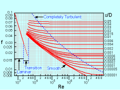 As is discussed in the Viscous FLow in Pipe section, flow in a circular pipe can be solved with the aid of the Moody chart (obtained from experiments) where the pressure drop term is expressed in terms of the friction factor (f). As shown in the Moody chart, the friction factor is a function of the entrance length (l/D), relative roughness of the pipe (ε/D) and the Reynolds number (Re). |