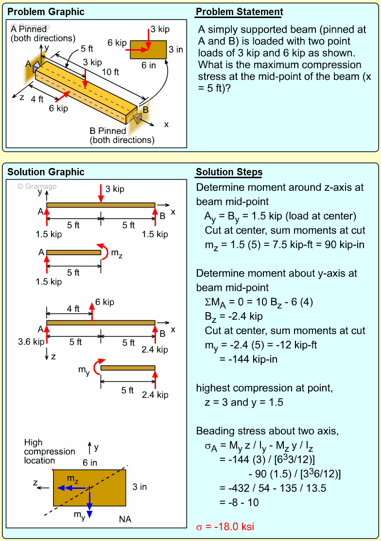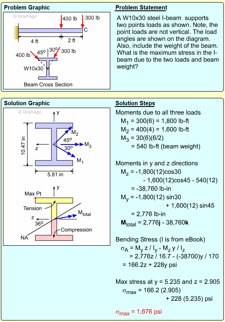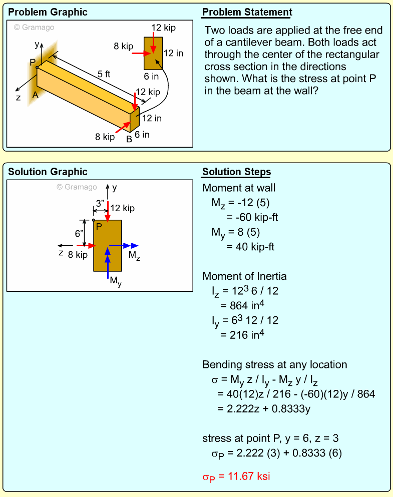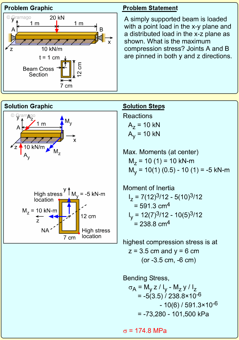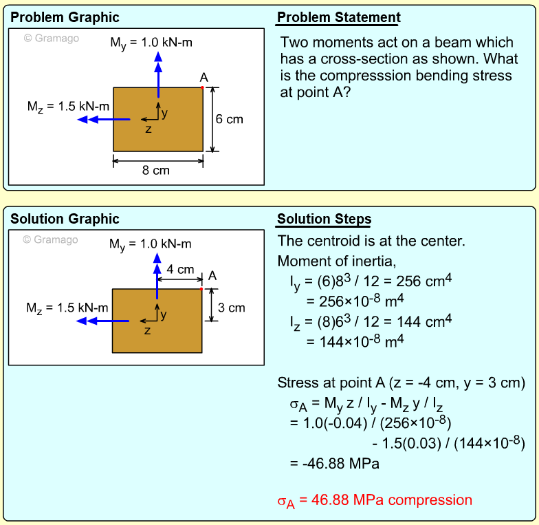Maximum stress at point A, y = 0.05 m, z = 0.03 m, is