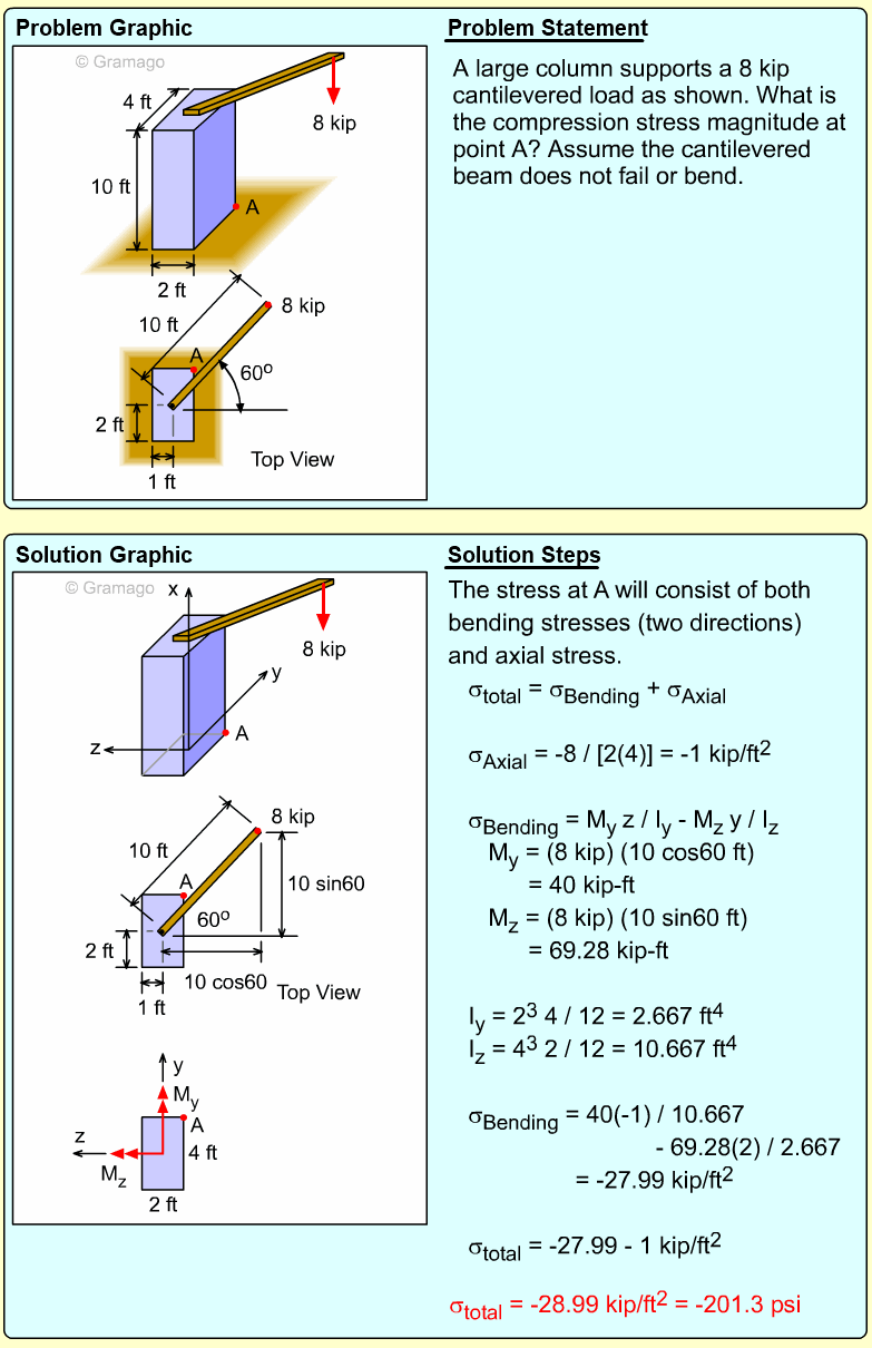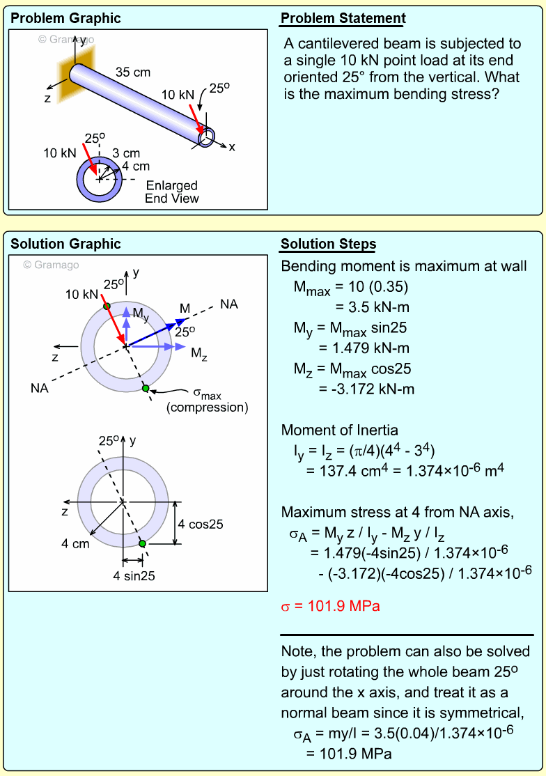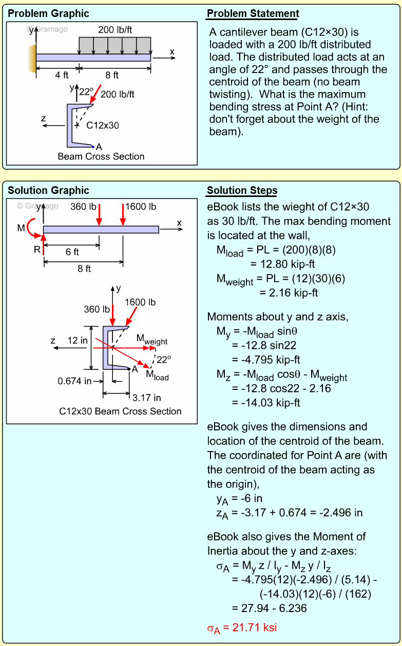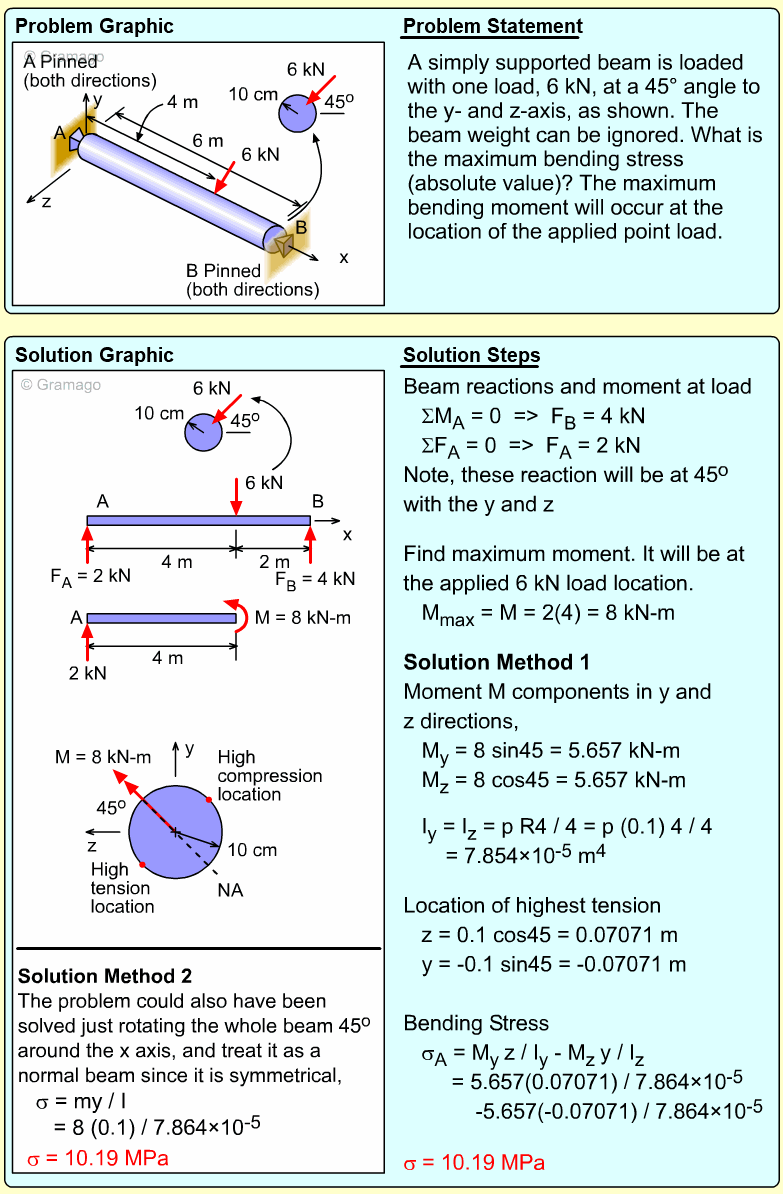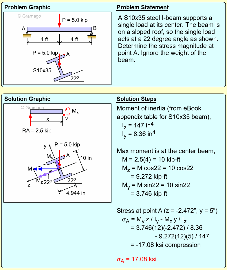 Maximum stress at point A, y = 0.05 m, z = 0.03 m, is
