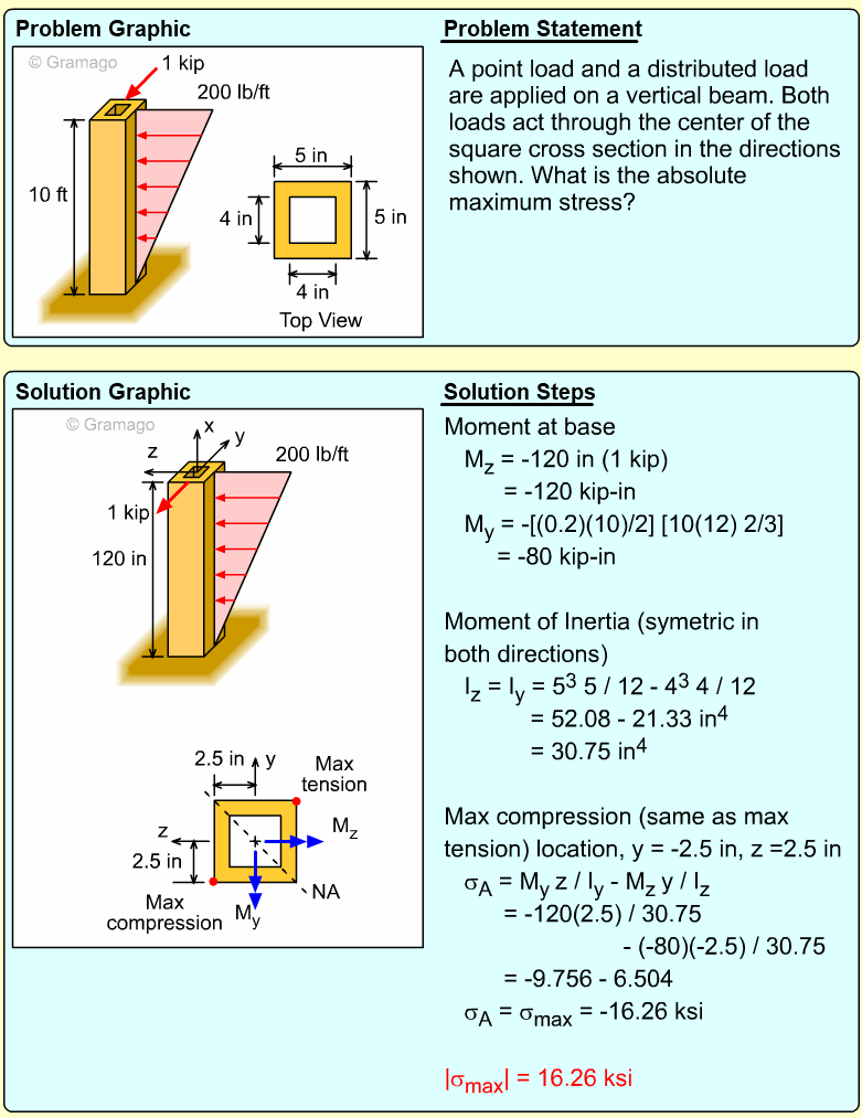The maximum moment at one of the four corners. From inspection, both the My and Mz moments will cause tension stress in the upper left corner, point A (don't forget that Mz is negative value). Similarly, both moments will cause compression stress at point D. These two points, A and D, will be the maximum tension and conpression stress, respectively. In this case, the magnitudes for both the maximum compression and maximum tension will be equal.