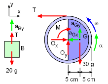 The unbalanced wheel O has a mass of 30 kg and is connected to a 20 kg counter weight block, B, with a continuous cable. If a constant moment of 15 N-m is a applied to the wheel in the clockwise direction, what is the force exerted on the wheel by the pin at center point, O? At the instance shown, the angular velocity, ω, is 4 rad/s. The center of mass, G is 5 cm from the center and the wheel's radius of gyration is 7 cm (about center point O). Assume the pulley is mass-less and frictionless. |