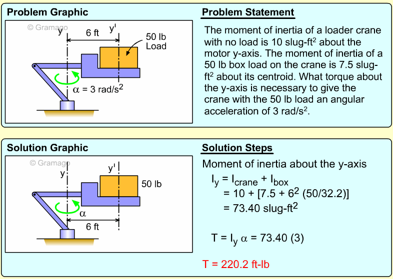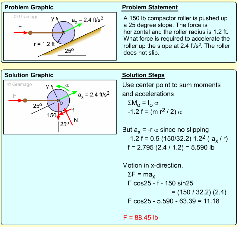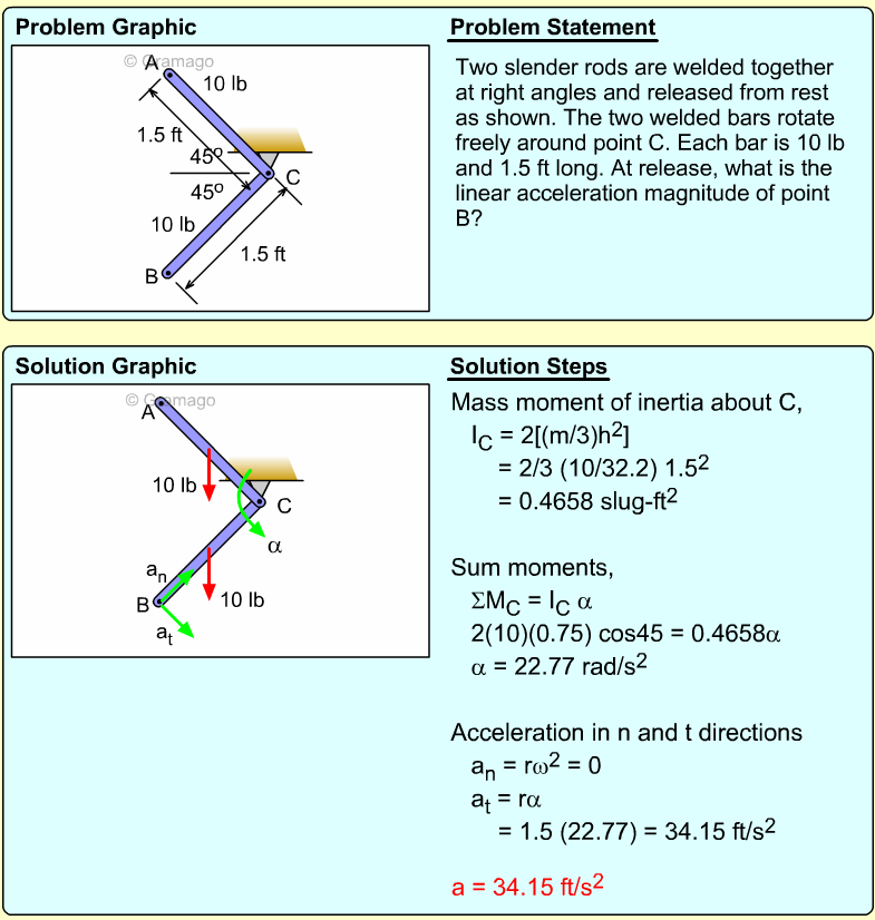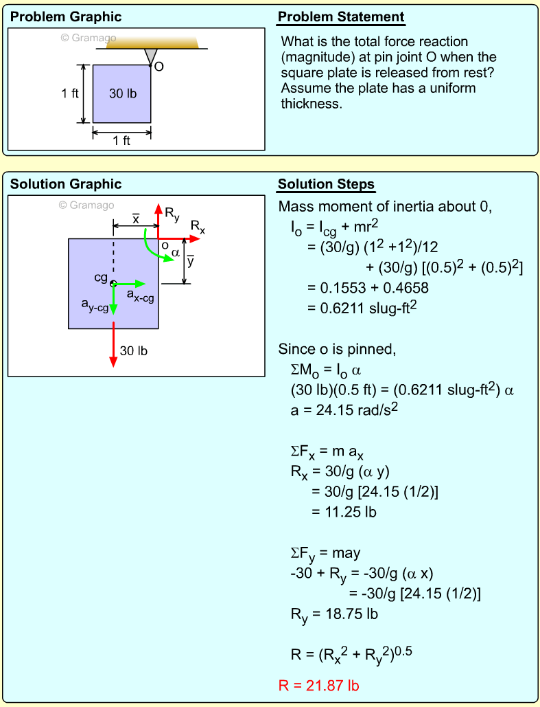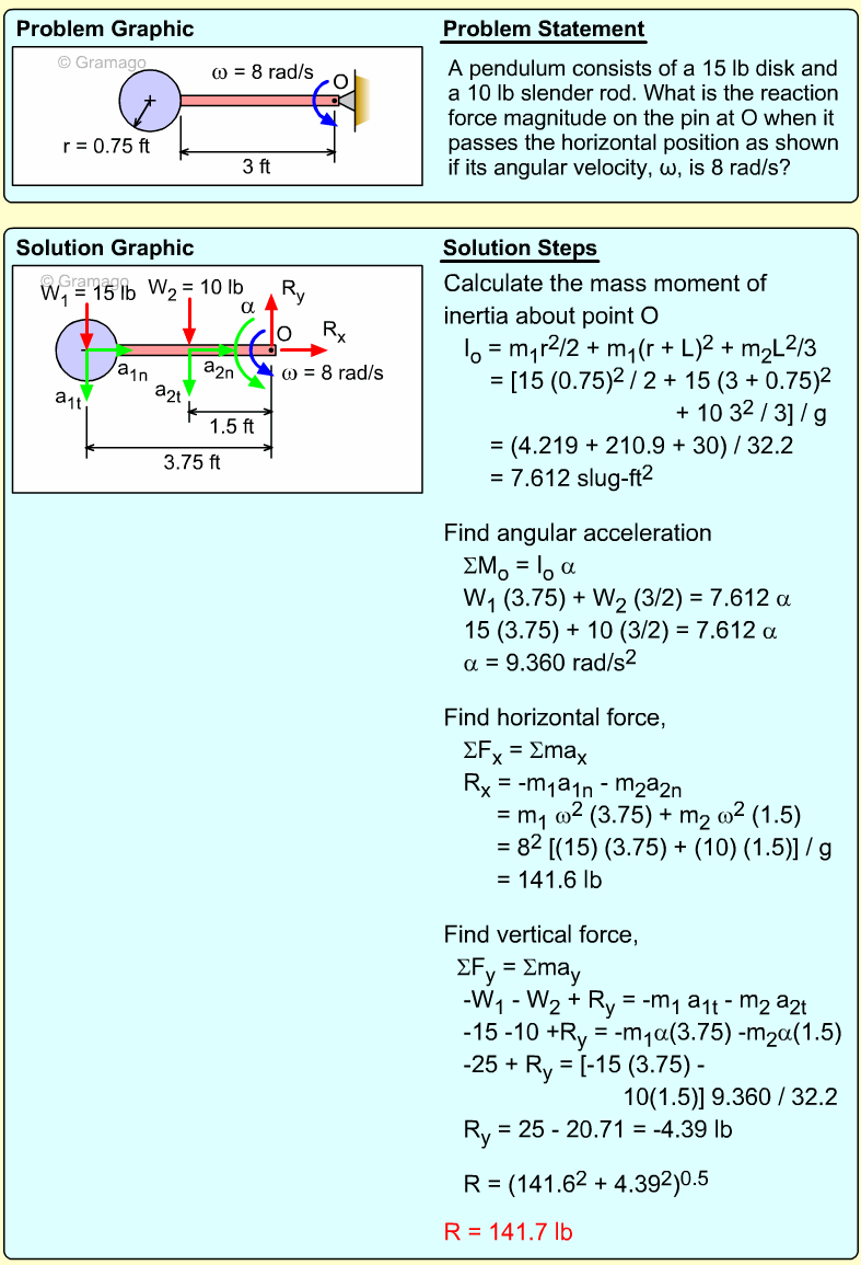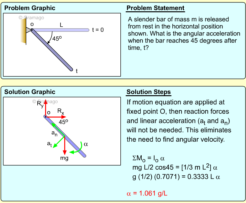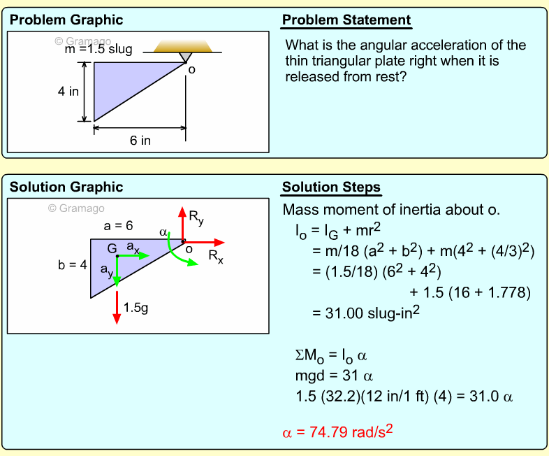 Find the angular equation of motion for the wheel by summing all forces about O. Note, the wheel weight acts through the wheel's center of mass, and the moment of inertia, I, is related to the radius of gyration, k (I = mk2). Equating the moments to the angular acceleration gives,