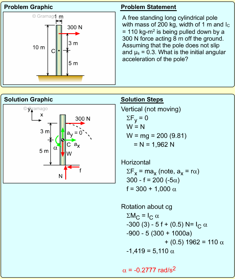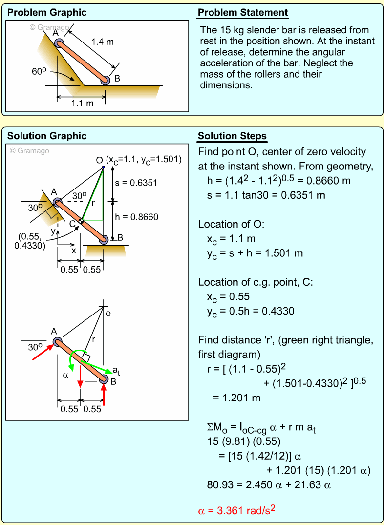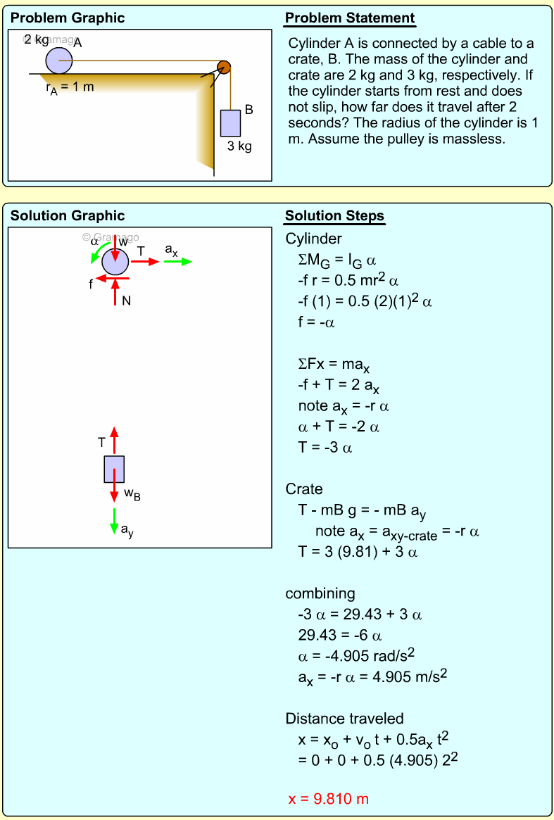 These three equations have five unknowns, so additional relationships need to be identified. One idea is to use the IC point to relate α and the two linear accelerations, aGy and aB. At the instant given, the spool is pivoting around the point where the ceiling cable is attached to the spool, and thus has zero velocity. Thus,