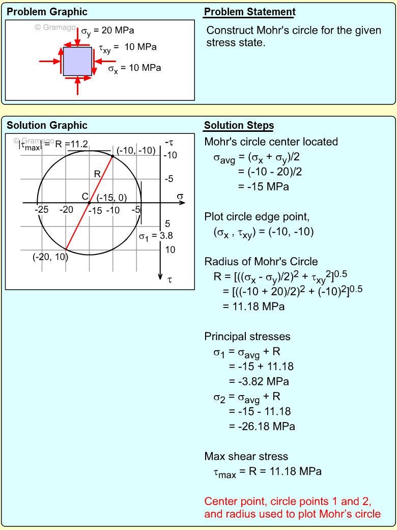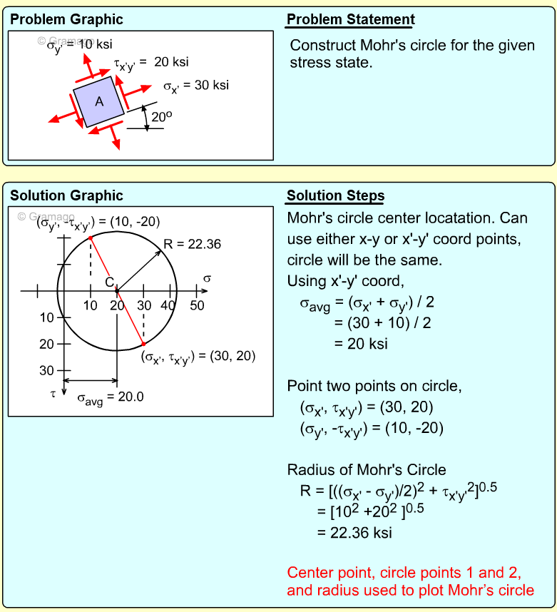 Remember, the shear stress is plotted positive in the downward direction. From the plotted center and points on the circle, the radius (shear maximum) can be determined.