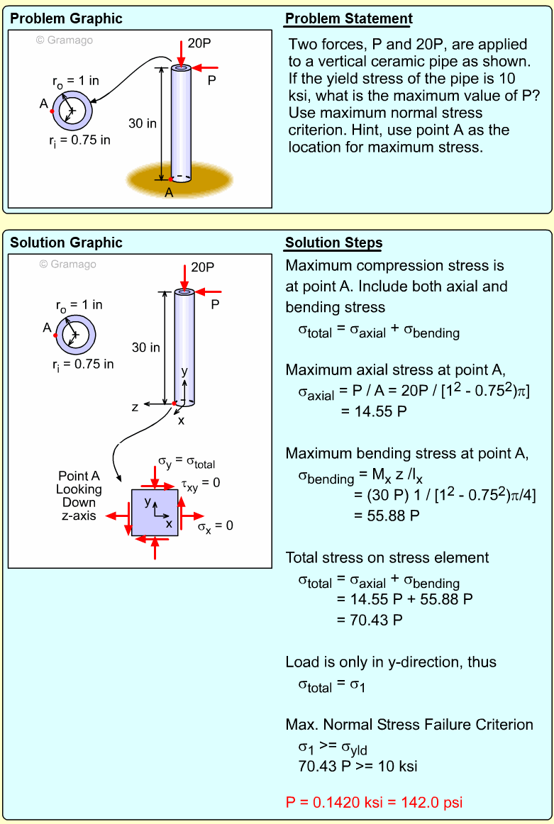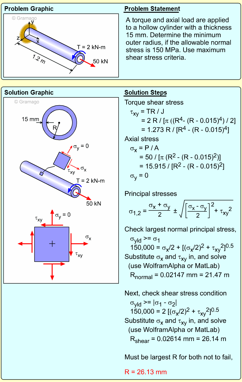 The goal is to determine the largest radius R for which the shear stress does not exceed 100 MPa. This can be found using "Maximum Shear Stress Theory" that states that for any combination of loading for σ1 and σ2, the shear stress cannot exceed σyld/2 = τmax. This condition gives three separate possible situations that need to be checked,