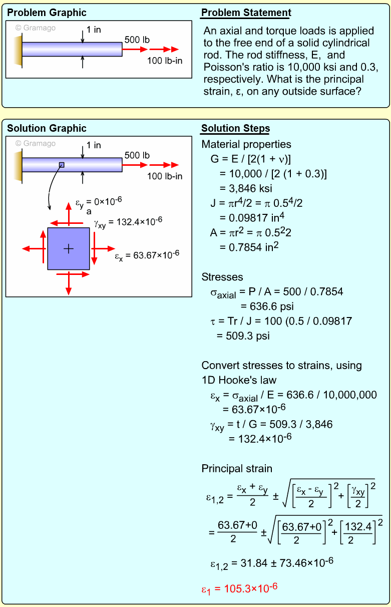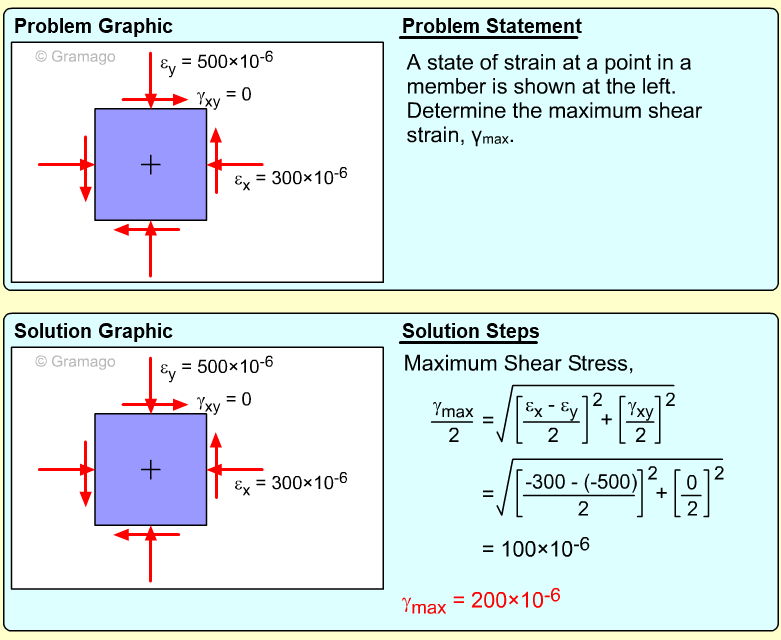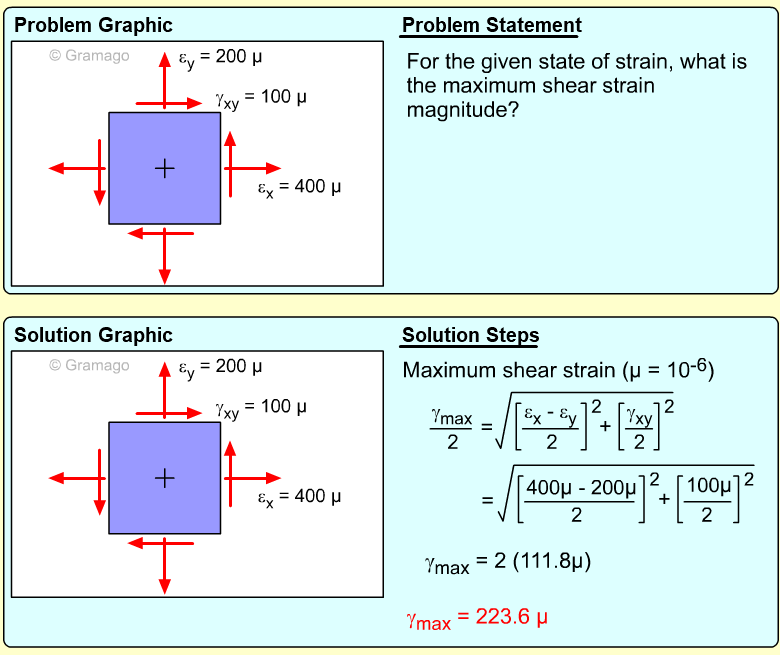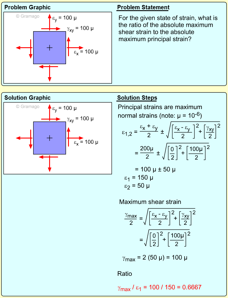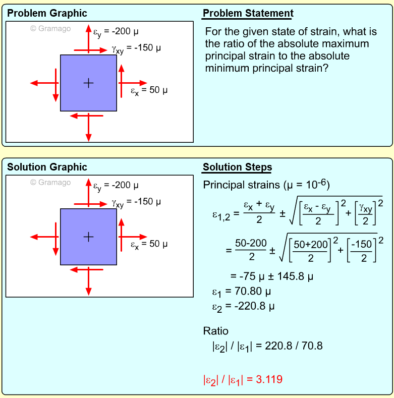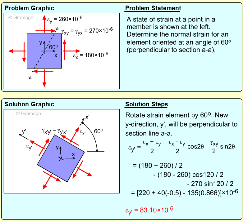 Notice there are two possibilities. Both will give the same principal strains as will be shown below. For 15o, the two normal strains are,