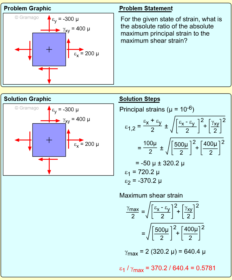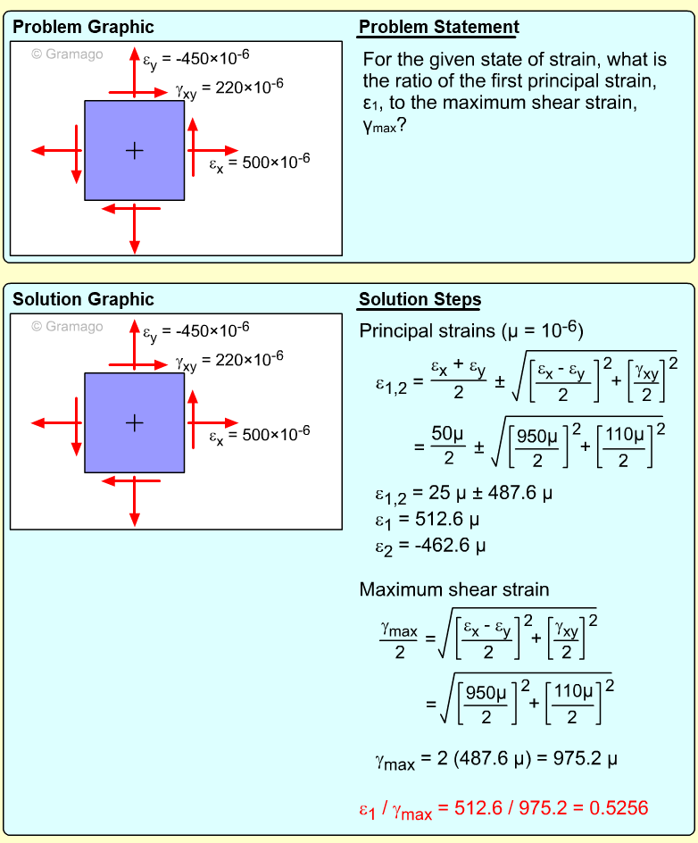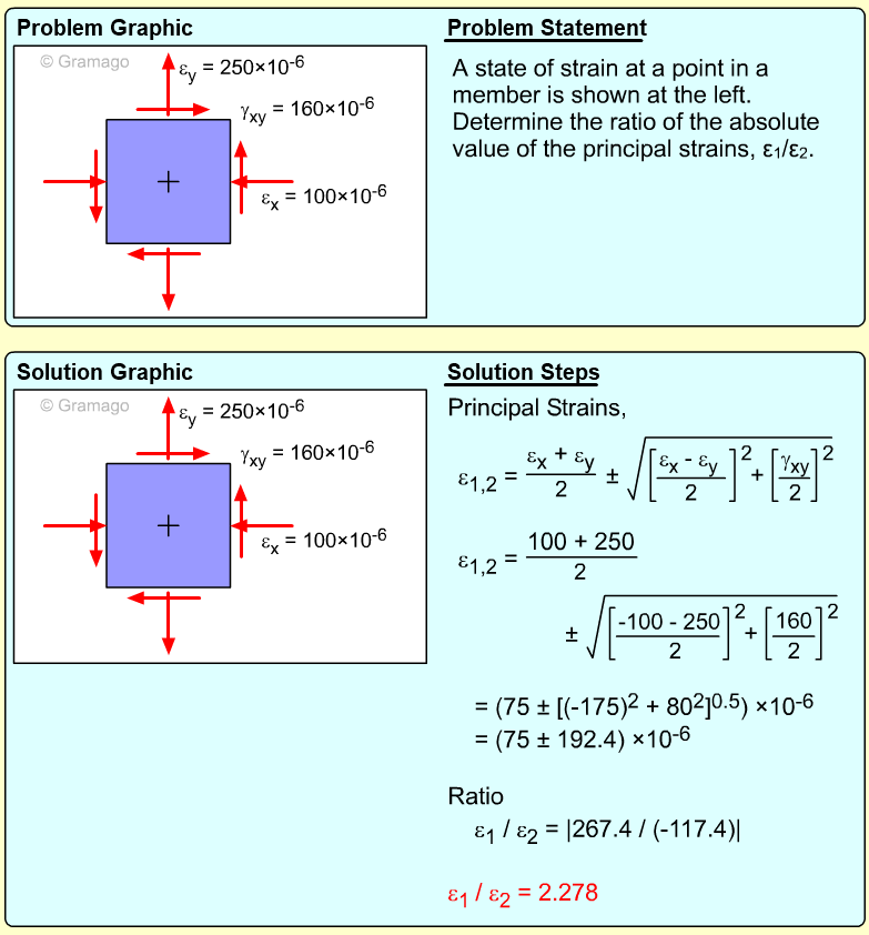 The principal strain equations could be used directly, but another way is to find the principal angles, and then use them to find the principal strains. The principle angles for this strain state are