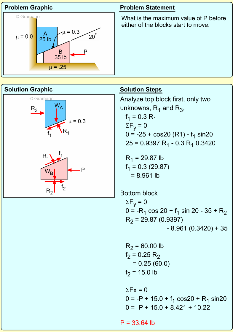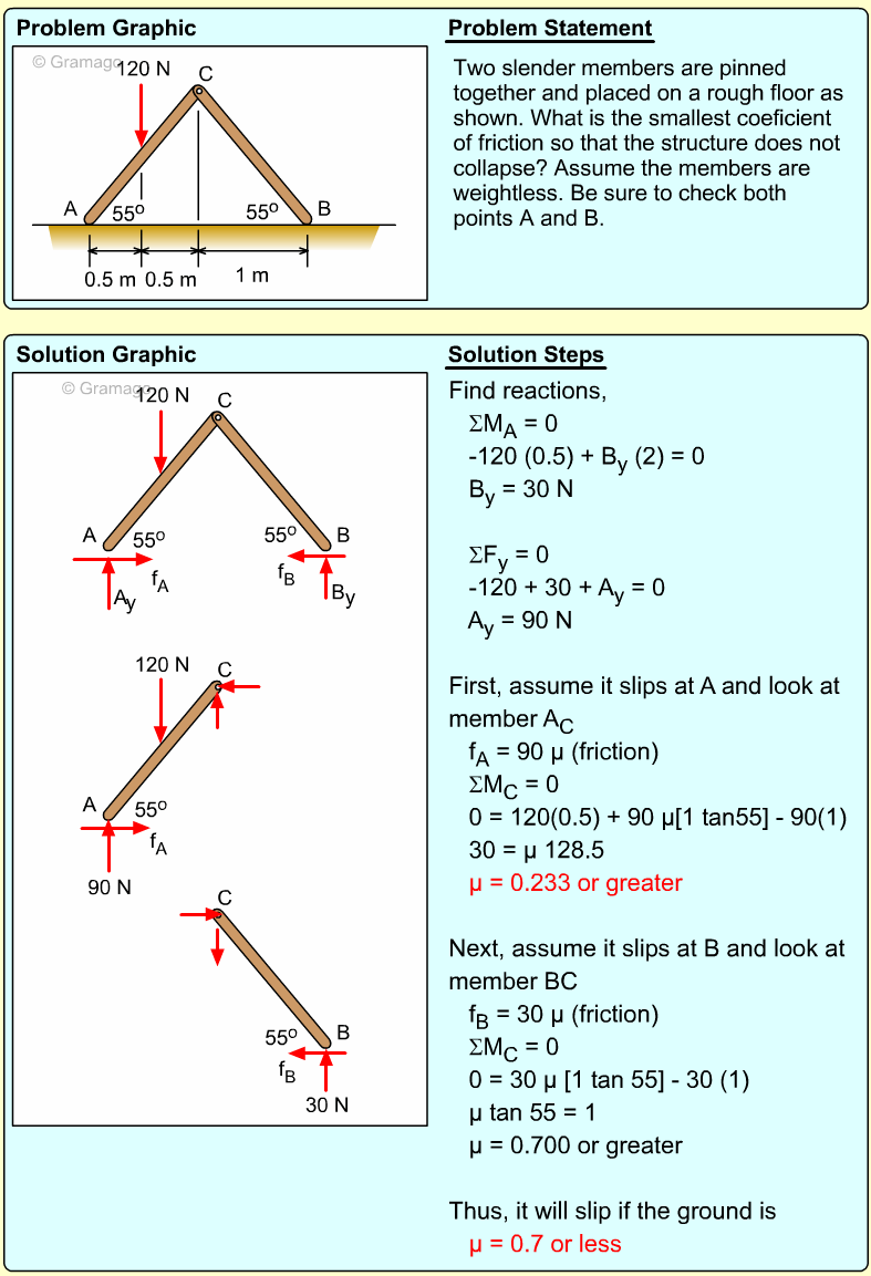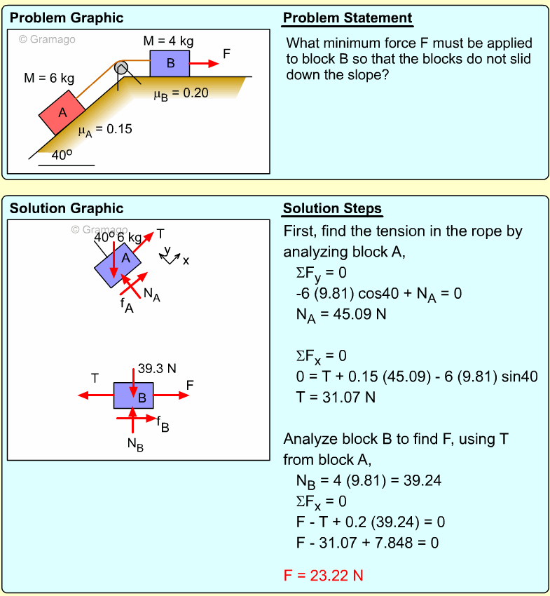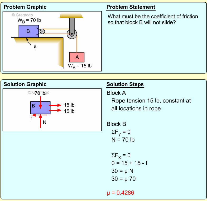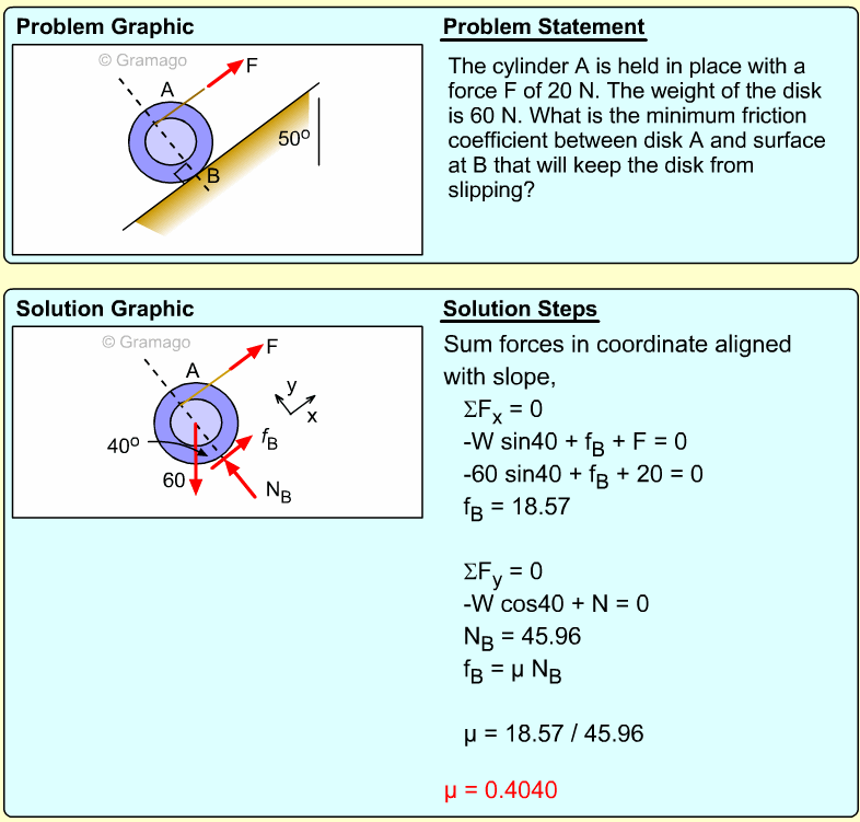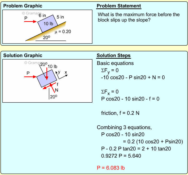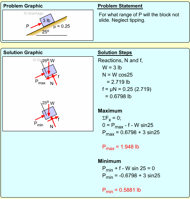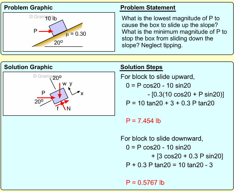 Notice from the calculation that static coefficient of friction, μ, is independent of the weight of a box. Also, knowing the inclination angle of the bed is a convenient way of measuring the coefficient of static friction. |
