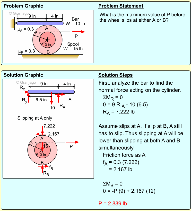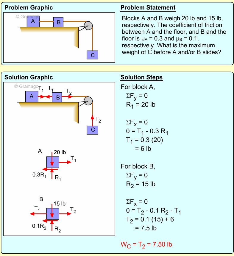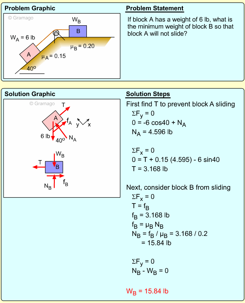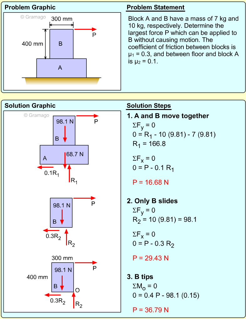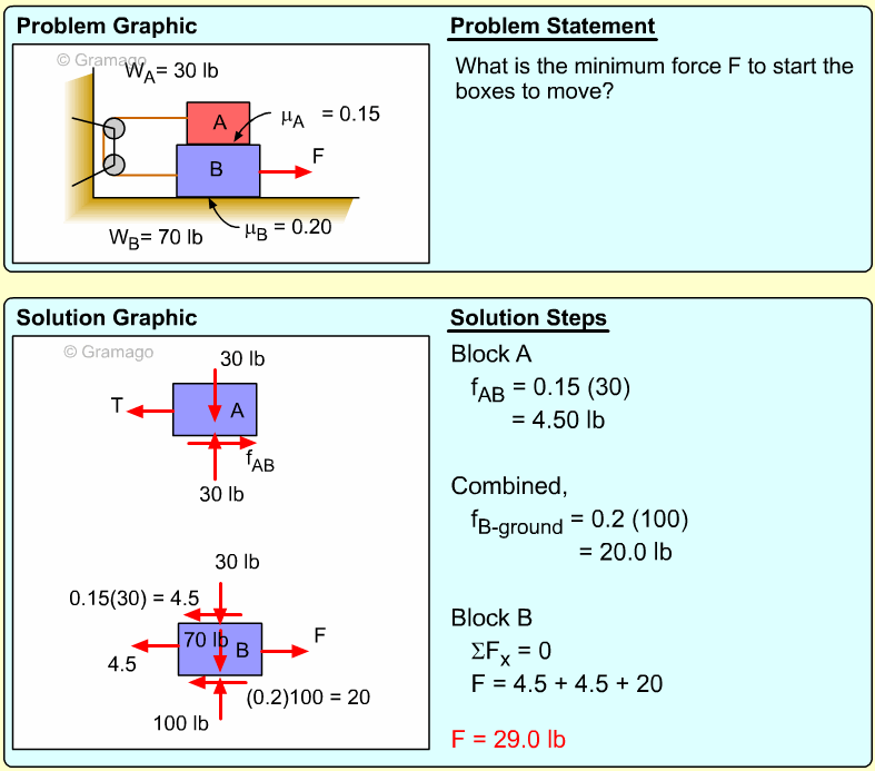 There are three possible forces acting on the box, its weight, reaction force due to the ground and the friction force. The location and direction of these forces are shown on the free-body diagram of the box on the left. Let the resultant normal force, N be acting at point A. There are two unknowns, N and Fs.