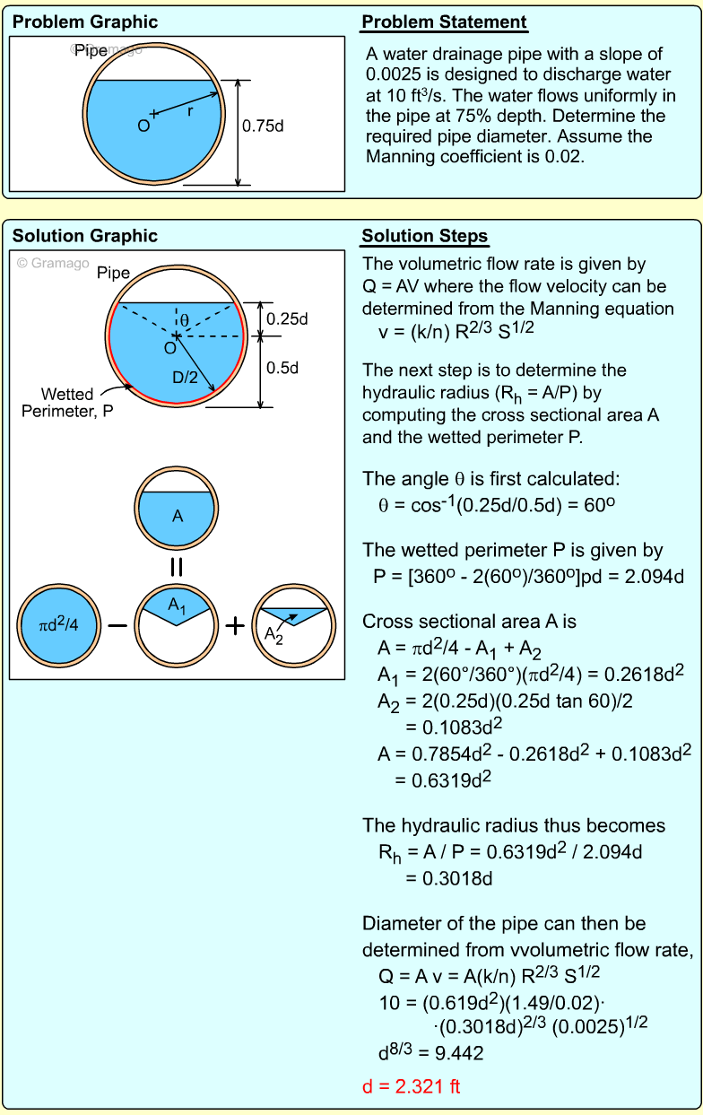 Given the design requirement that the pipe be half full, there will
