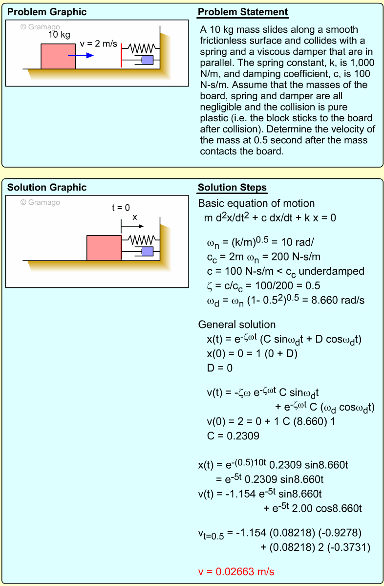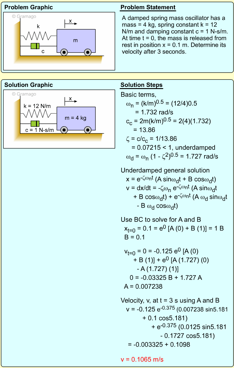 At t = 0, the initial conditions are x = -0.1 m and v = 5 m/s, giving,